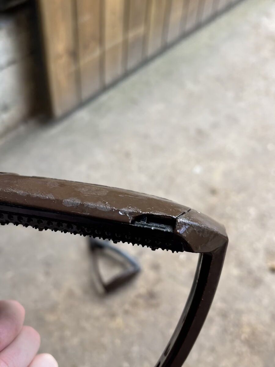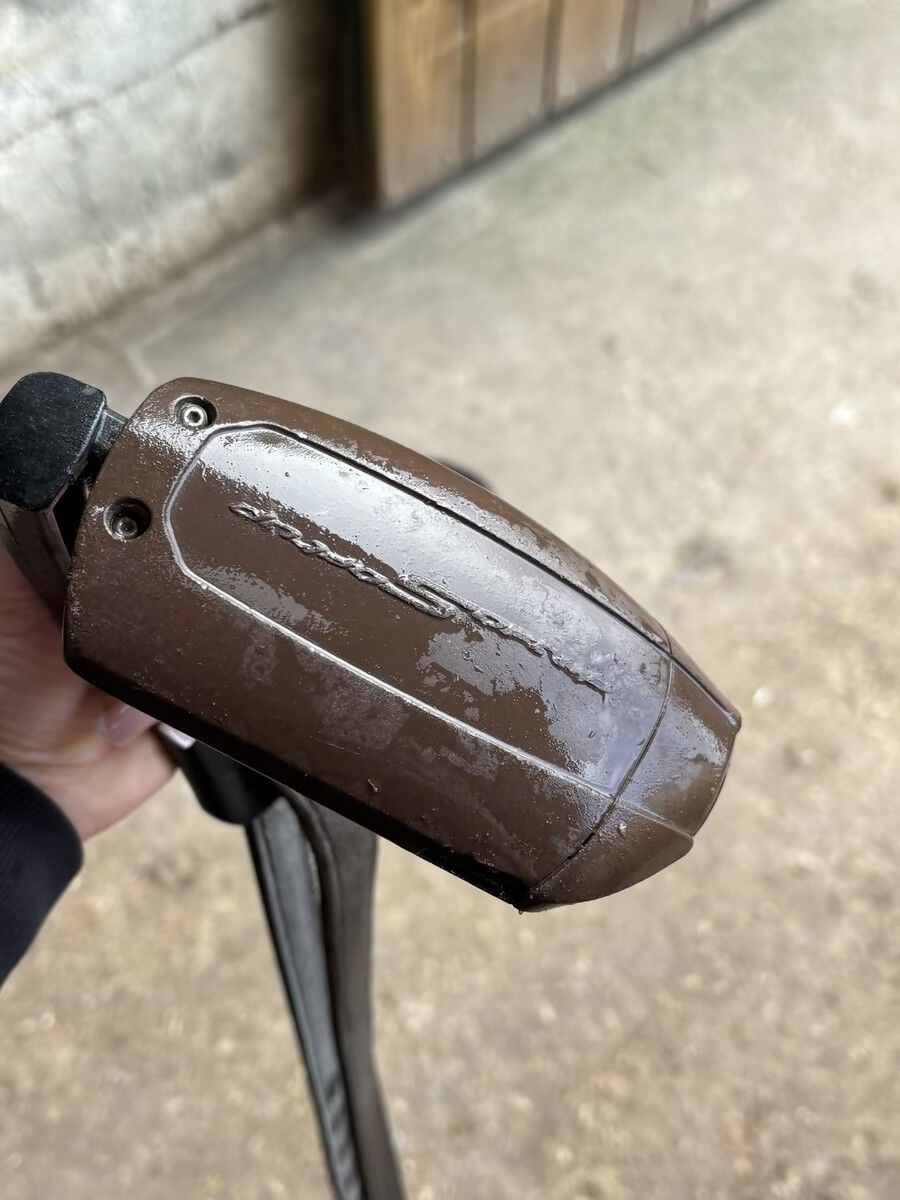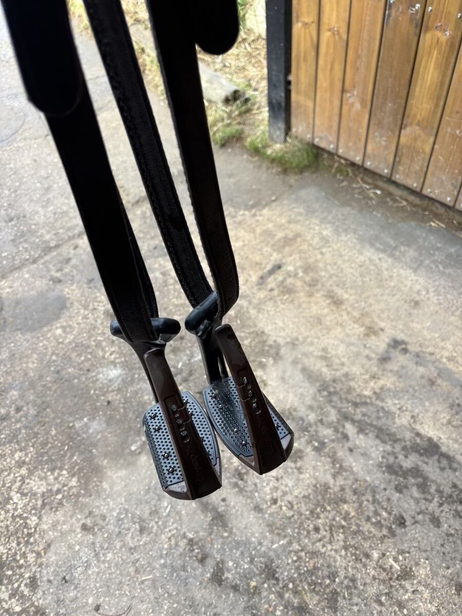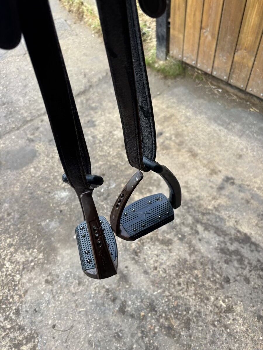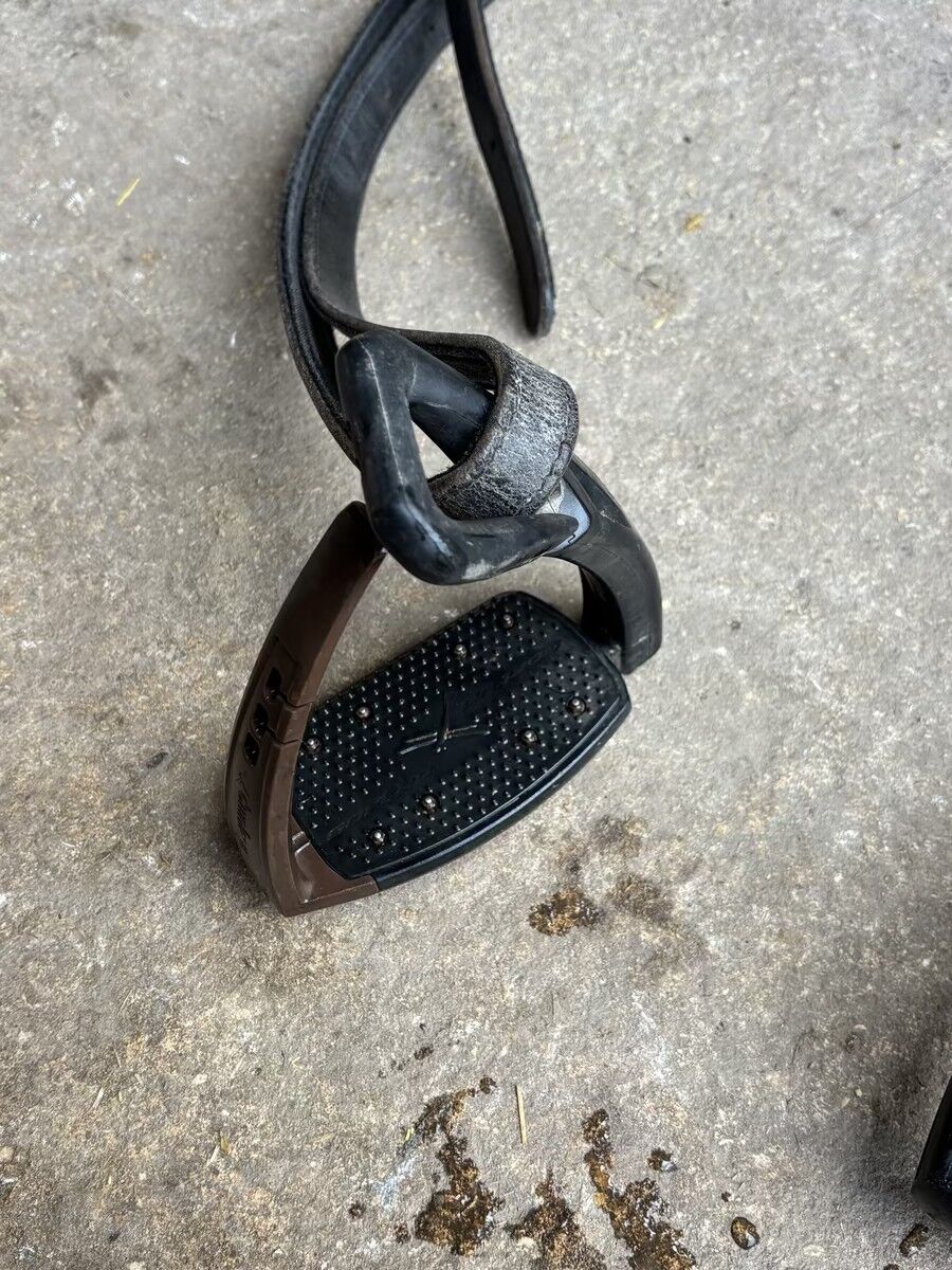 Petit trou sous un des étriers (ne se voit pas à cheval et n'altère pas son utilisation)