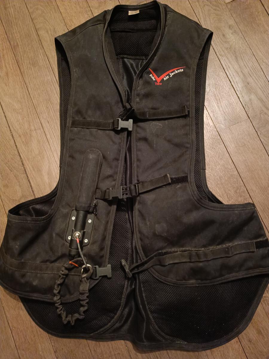 Air bag équitheme - point two taille L vendu avec une cartouche, en très bon état ( sera nettoyé avant envoie) je ne trouve plus l'accroche pour la selle mais cela se rachète , ce modèle est souvent utilisé pour le CCE car descend bien dans le bas du dos