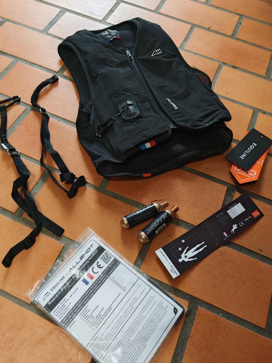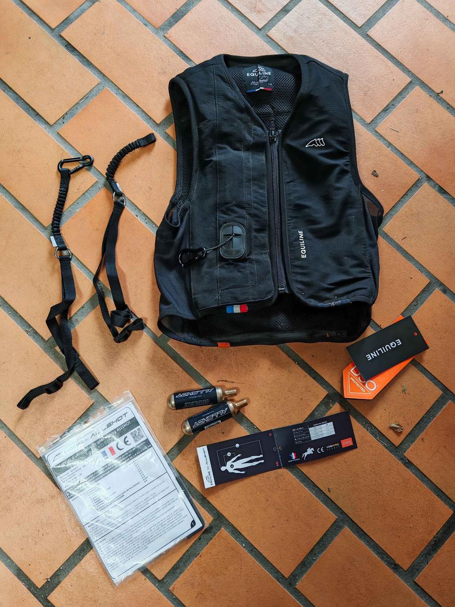 Gilet airbag Equiline taille enfant (T2 voir le guide des tailles en photos) Vendu avec 2 attaches de selle, 1 cartouche installée et 2 cartouches neuves, le mode d'emploi, l'instrument pour changer la cartouche, et toutes les étiquettes d'origine. Cartouches 30 cc Valeur 530€ sans les cartouches