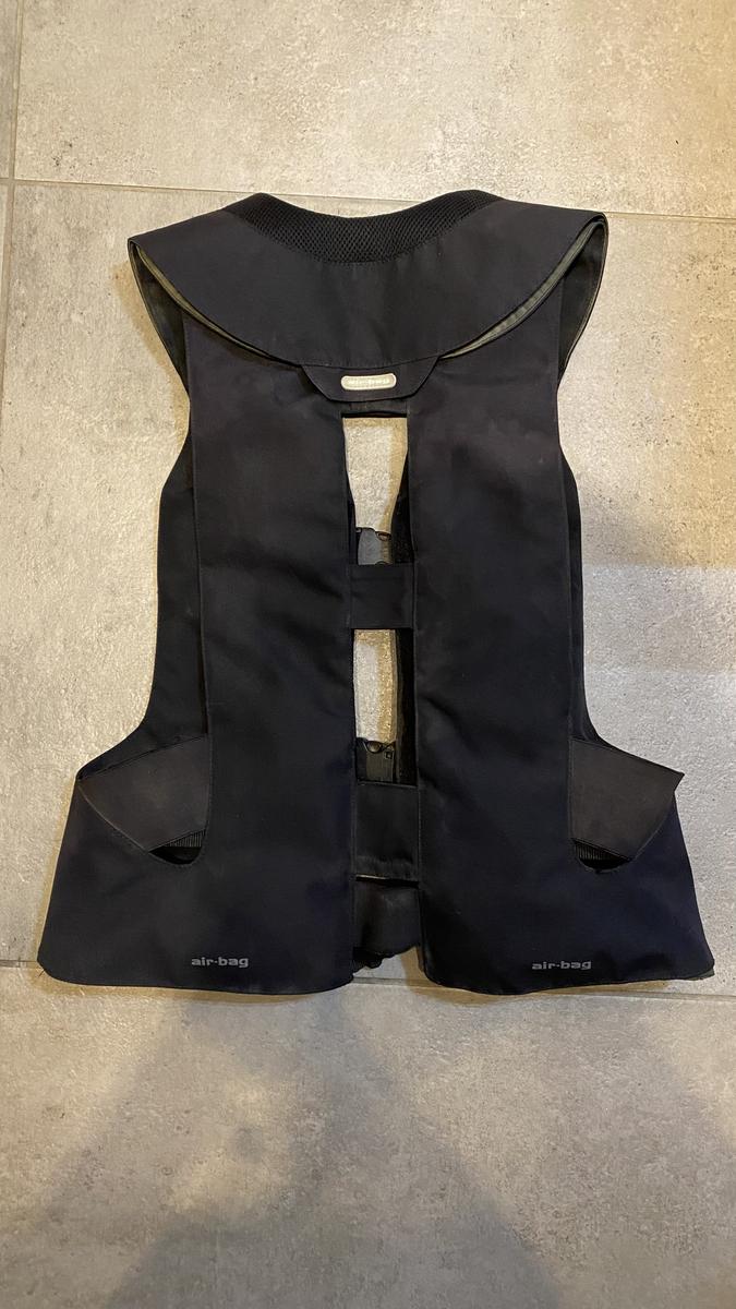 Airbag, Hit-Air, noir, taille adulte M, pas mal utilisé mais toujours en bon état, cause de vente: trop grand pour la cavalière, vendu avec une cartouche déjà insérée et matériel pour changer les cartouches