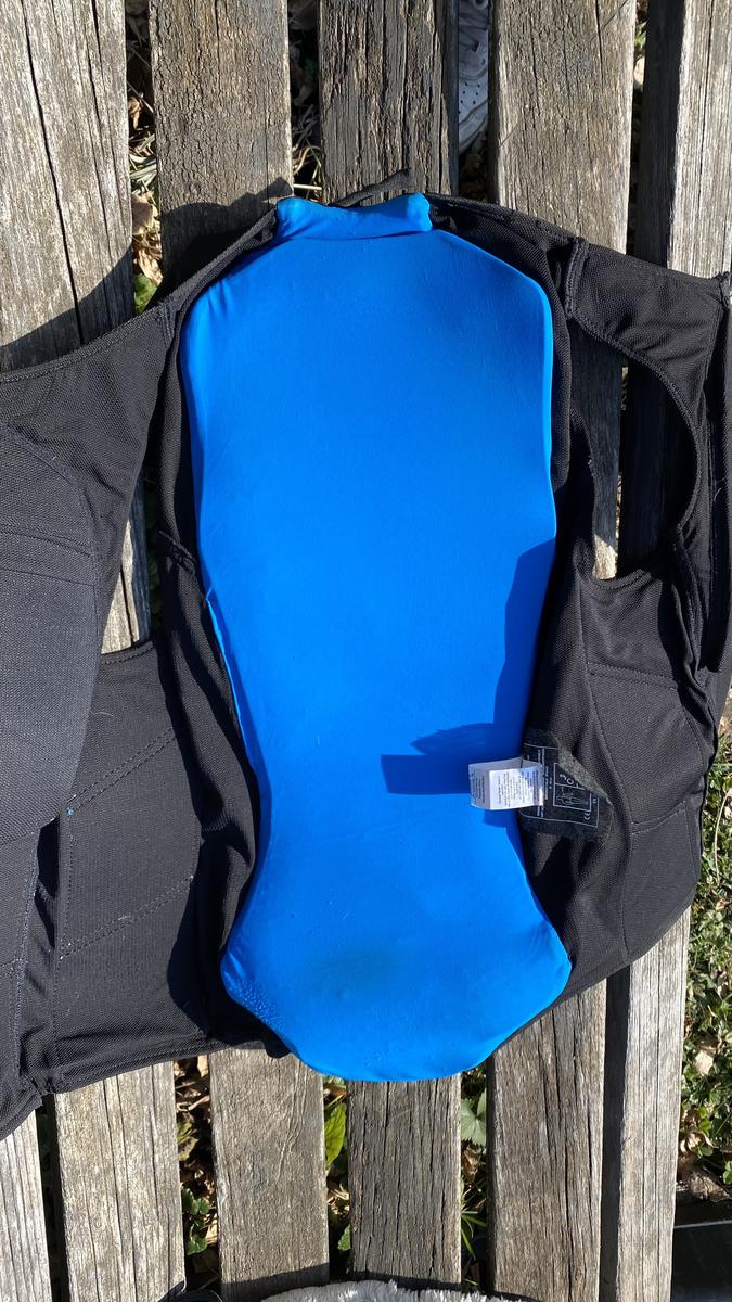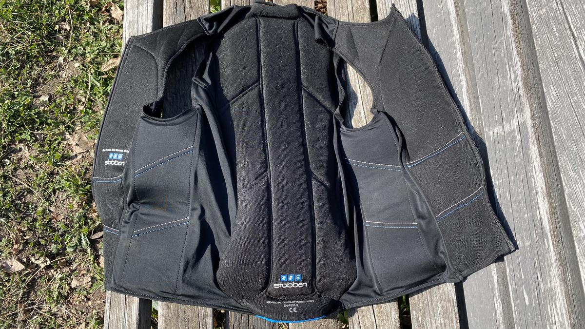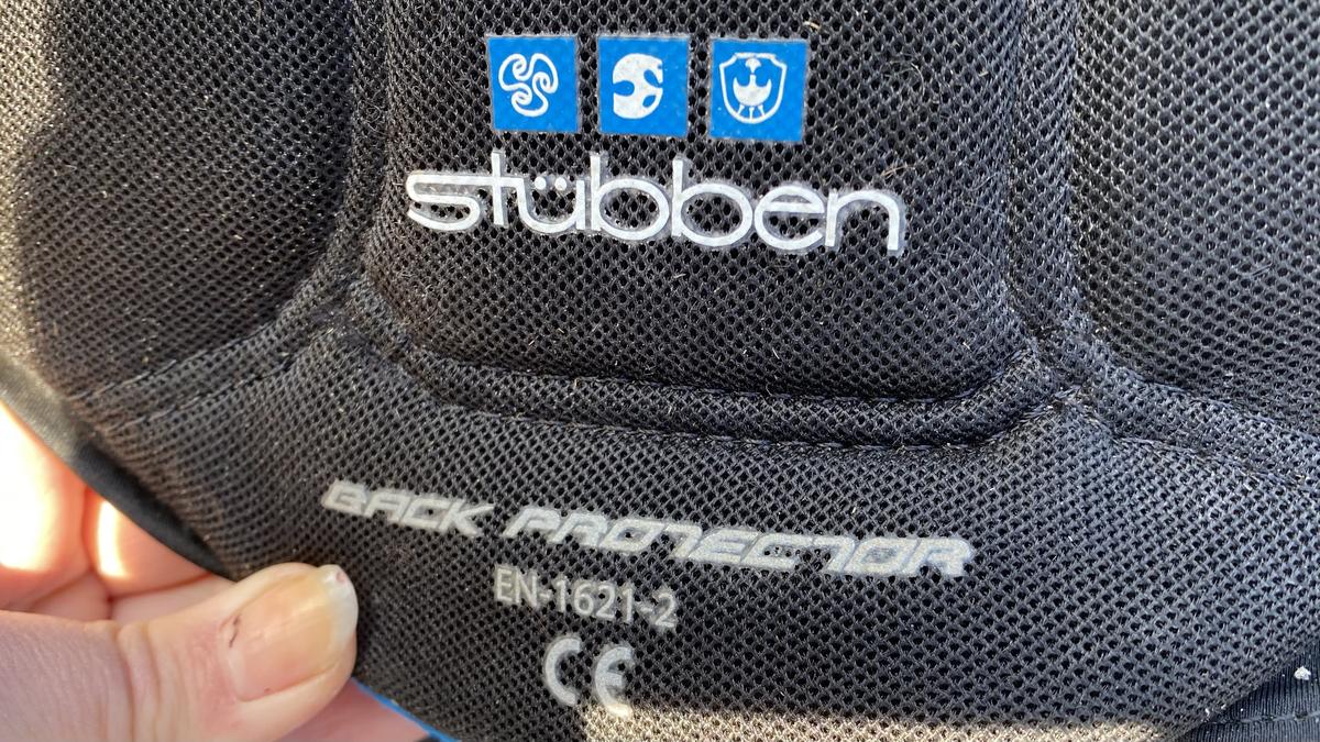 Protection dorsale pour cross ou saut, marque: stübben, couleur: bleu et noir, taille: S (protection de la colonne vertébrale de maximum 54cm), caractéristiques: protection à 360 degrés, thermo réglable et se moule à la morphologie du cavalier, pas mal utilisé mais toujours en bon état et efficace