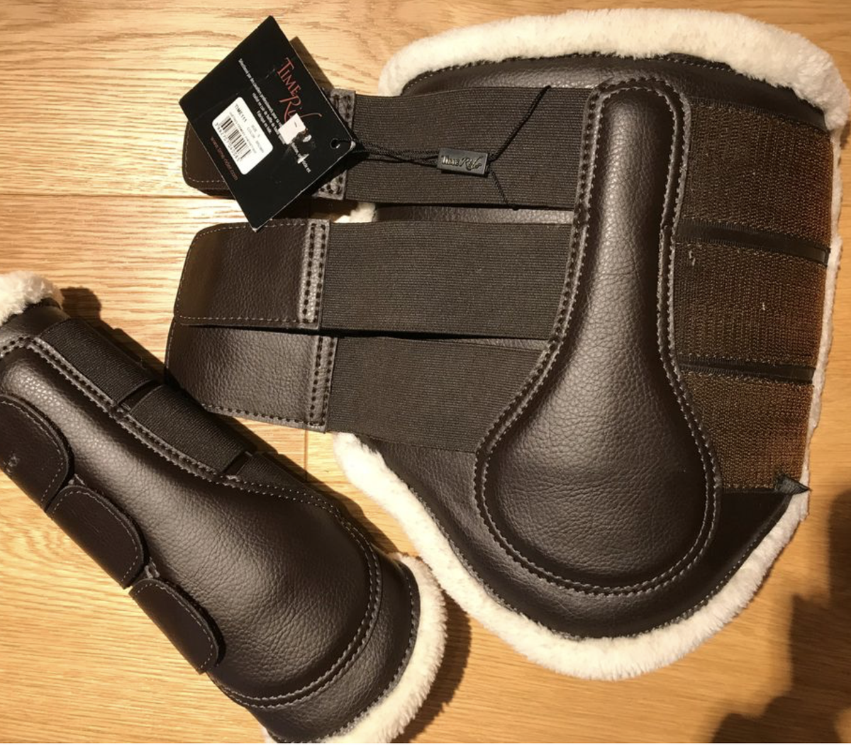 protections de dressage time rider marrons neuves doublées en mouton, taille S (correspondant a une taille cob ou pour un cheval avec des pattes fines type trotteur)