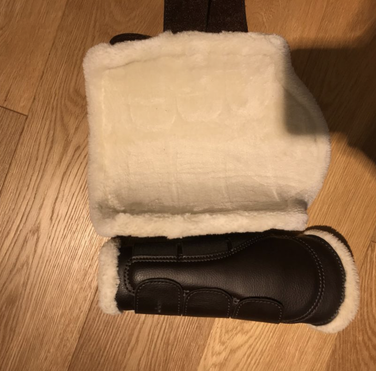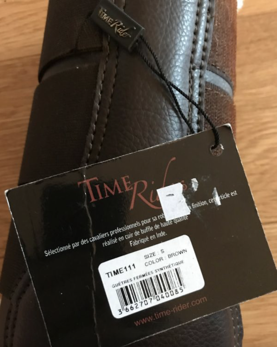 protections de dressage time rider marrons neuves doublées en mouton, taille S (correspondant a une taille cob ou pour un cheval avec des pattes fines type trotteur)