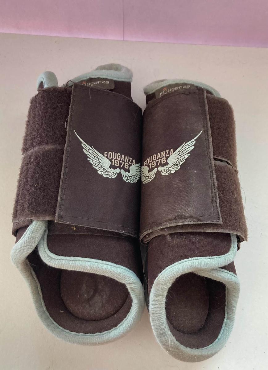 couleur marron et bleu clair taille poney et marque fouganza, les scratch tiennent très bien, en bon état