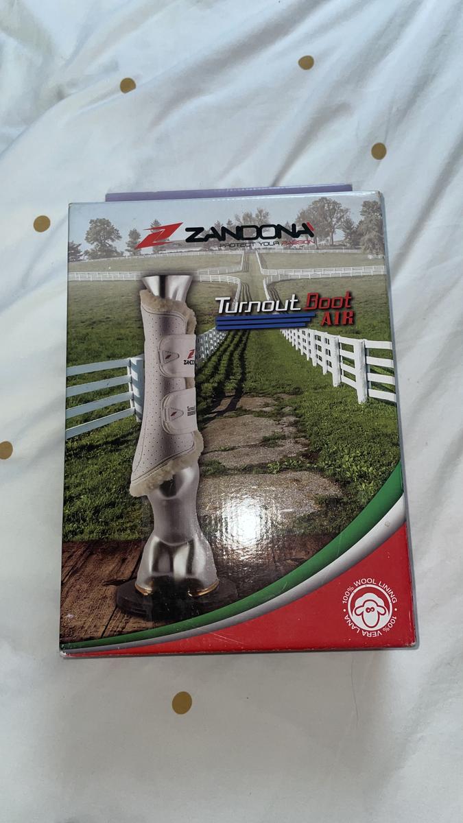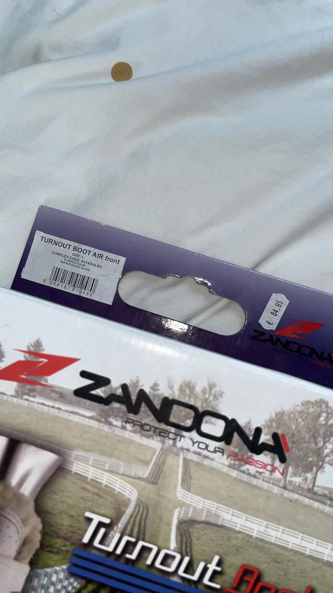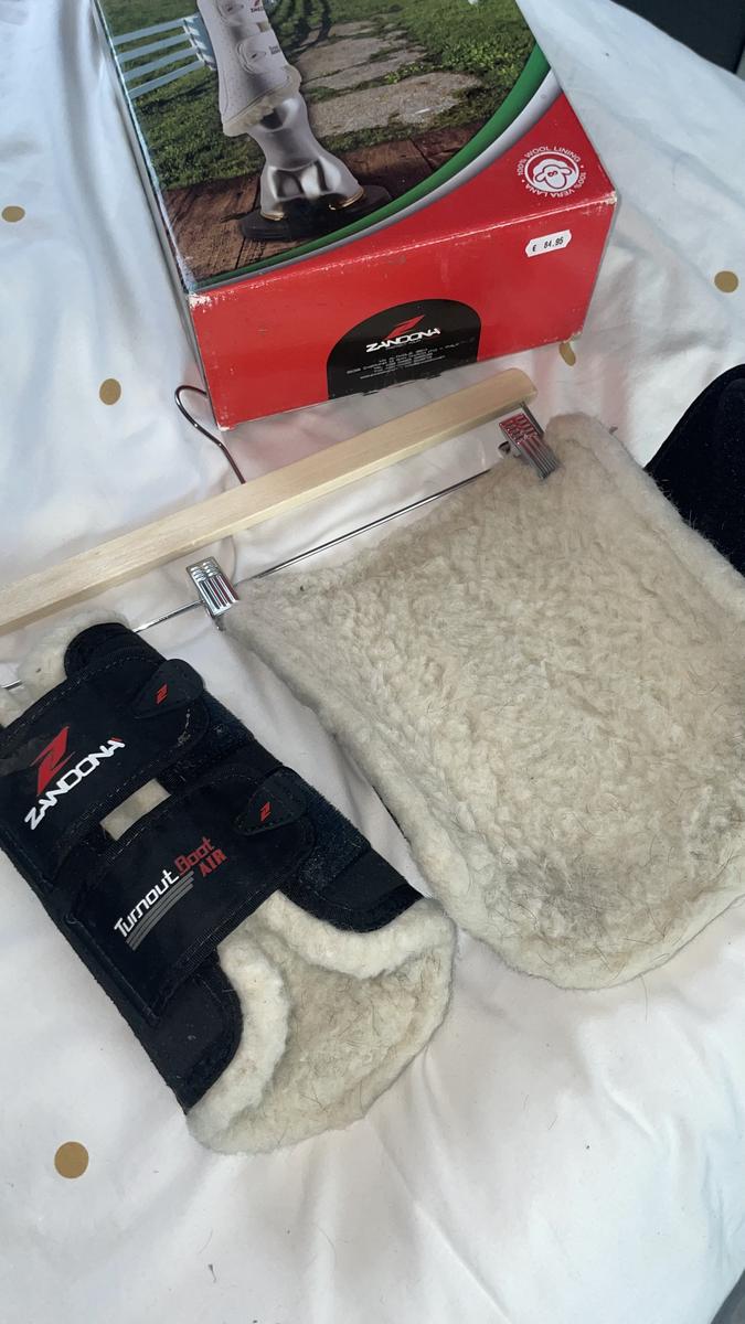 Guêtres antérieur zandona turnout boots air noires avec intérieur mouton. Ce sont des tailles L. Elles n’ont servi que deux fois car trop grandes pour ma jument et sont restées depuis au placard donc en parfait état, juste un peu sales à cause du sable.