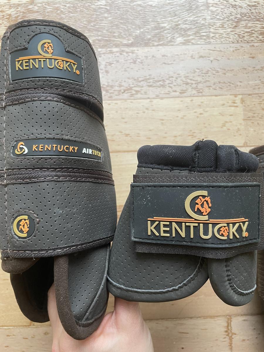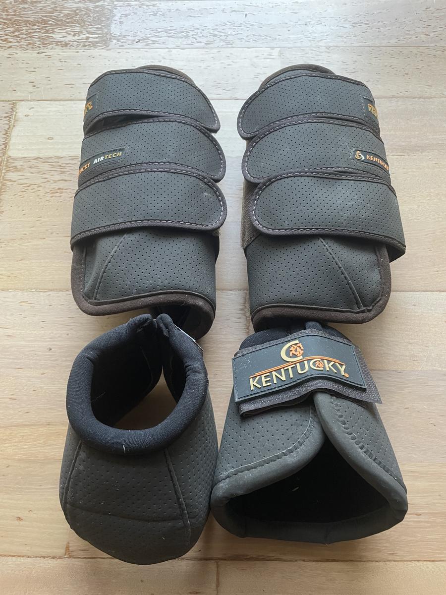 Bonjour, je met en vente ce lot marron de guêtres airtech taille cheval avec les cloches qui vont avec taille M de la marque Kentucky Horsewear. Le tout est neuf n’a absolument jamais servi et prends la poussière dans ma sellerie, d’où le fait que je m’en sépare. Acheté 129,99€ les guêtres et 59,99€ les cloches, je vends le lot à 130€.