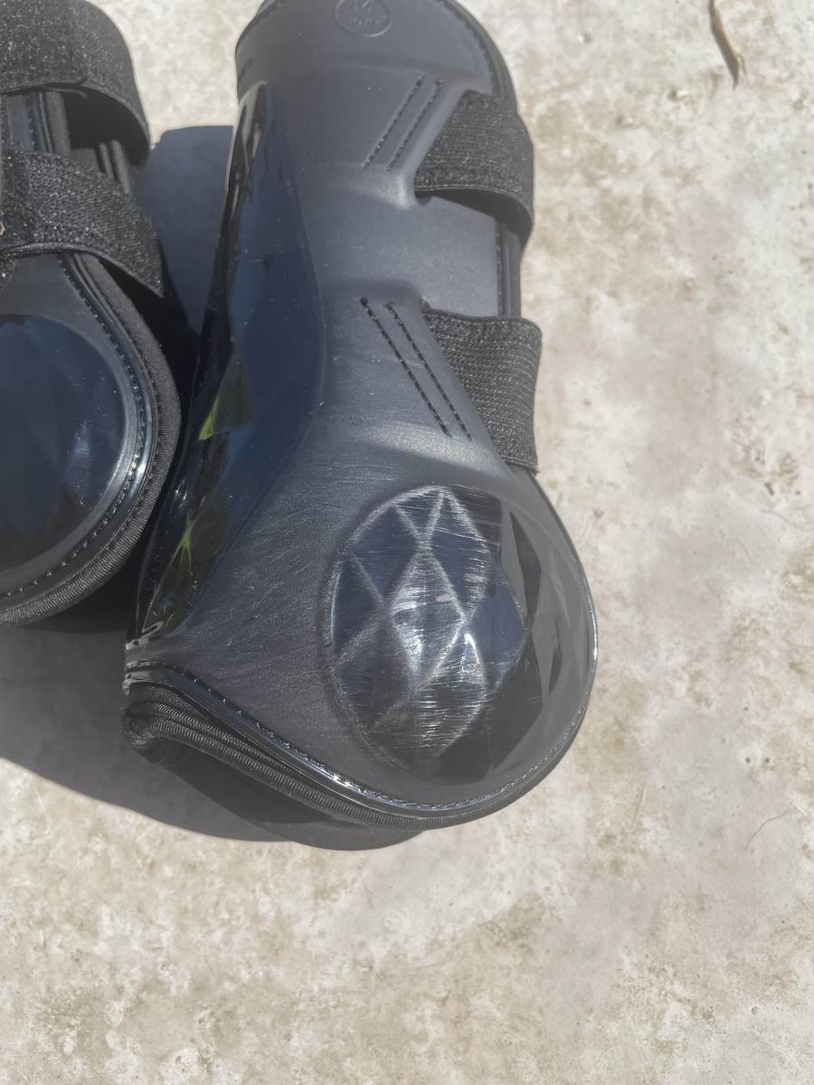 paire de guêtres fouganza noir. Taille M. Laver avant envoi. peut porter. Légèrement abîmé au niveau du frottement des antérieur. L’élastique n’est pas détendu. Globalement en très bon état.