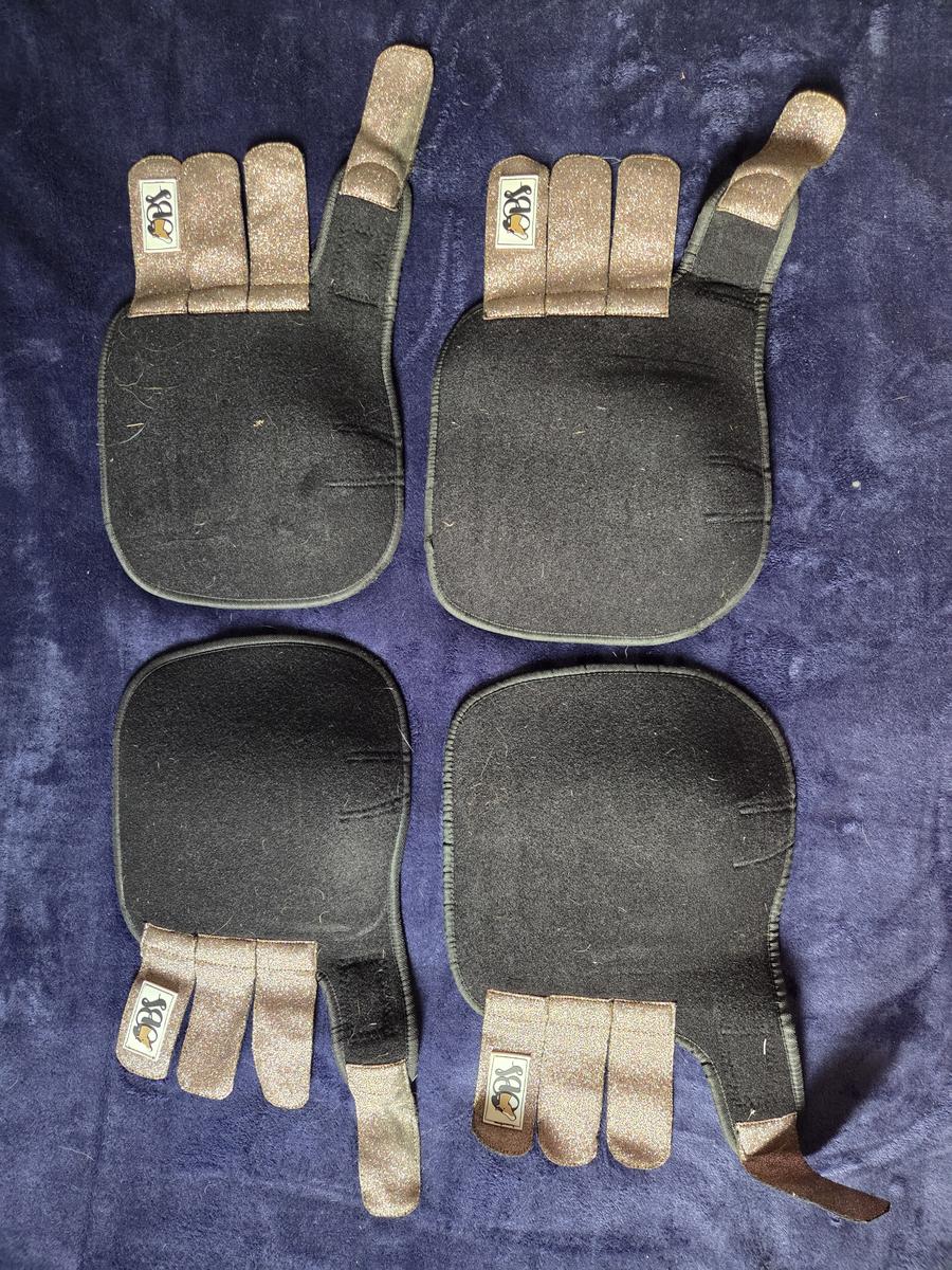 Lot de 4 guêtres de travail/cross marqué OBS (Petite sellerie indépendante "Oh la Belle Sellerie"), très souple avec de très beau scratch pailleté