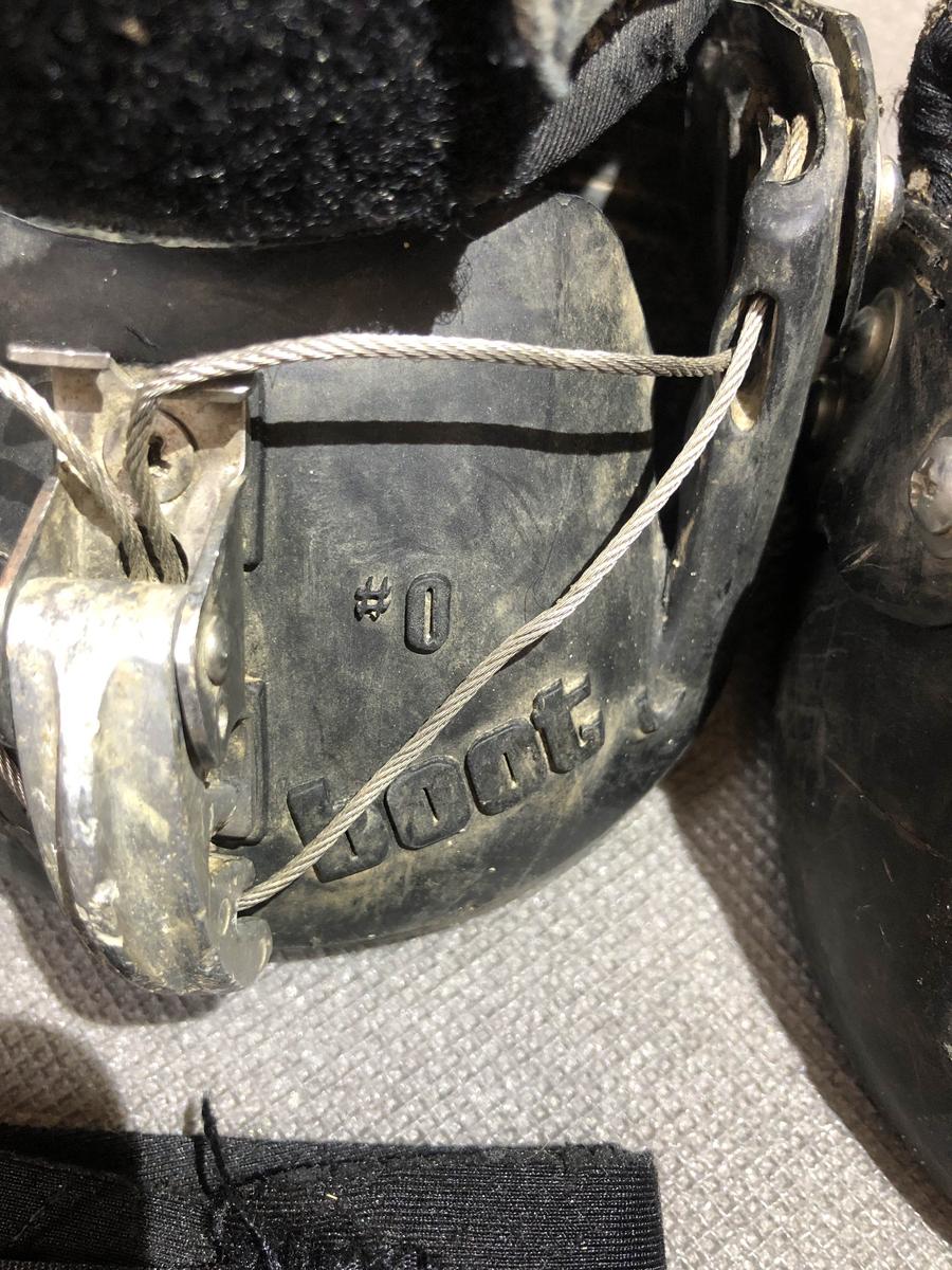 Les chaussures sont abîmées, la semelle est cependant intacte, il faudra certainement prévoir de changer le câble de serrage. D’où le petit prix.