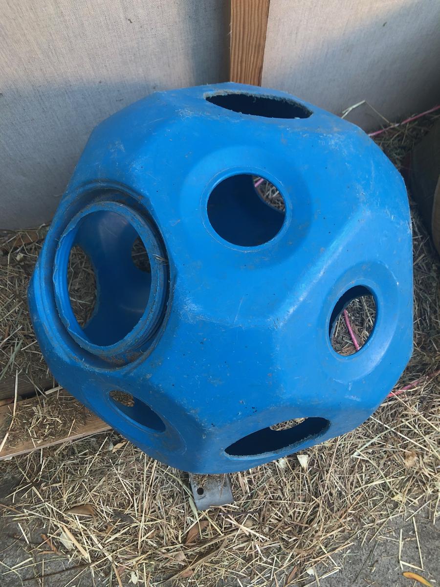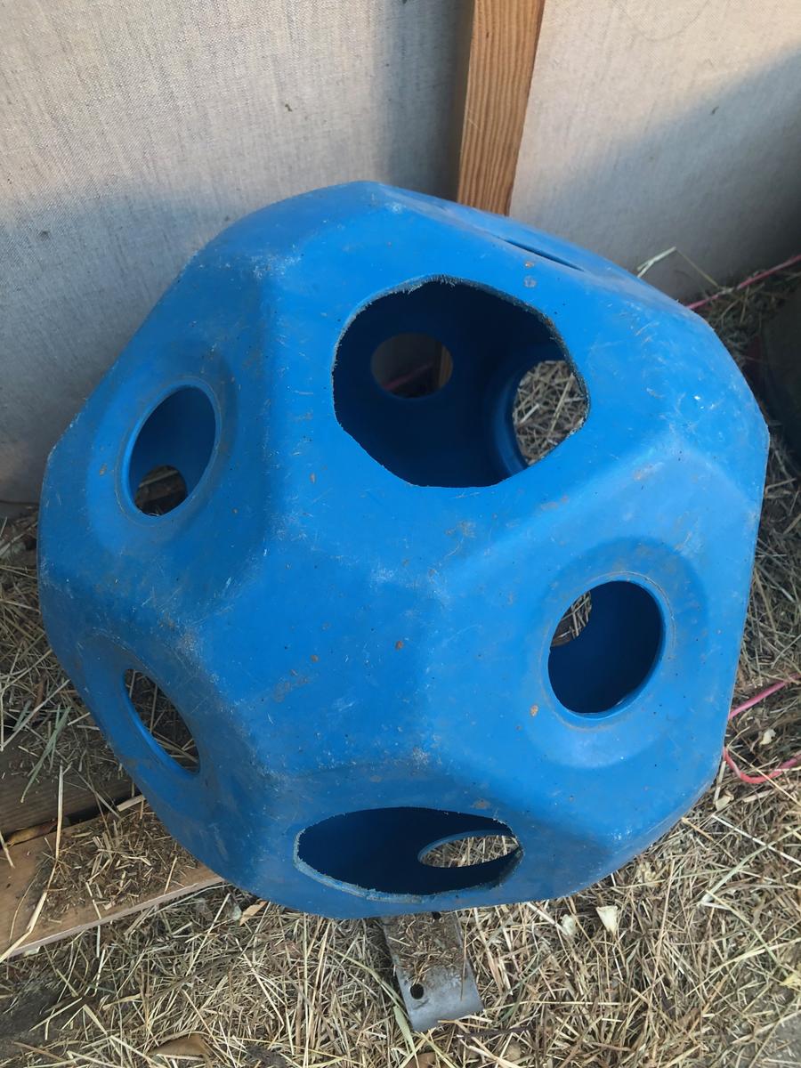 Jeu pour cheval boule à foin, permet d'occuper ton cheval au parc. Certains trous ont été agrandis pour plus de facilité pour attraper le foin. Boule bleue, à venir chercher sur place à Marseille.