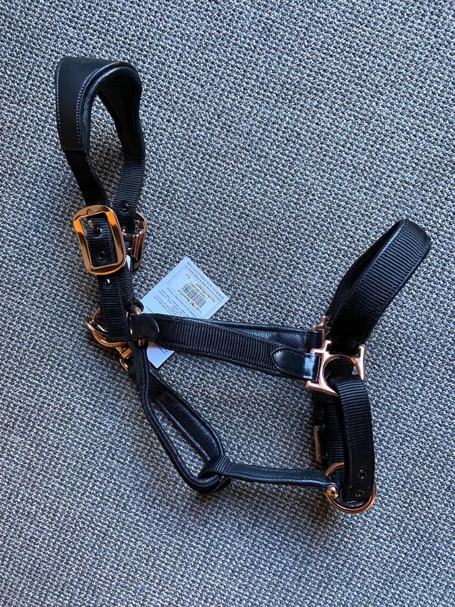 Licol Flags & Cup à bouclerie dorée neuf, cuir noir, têtière large