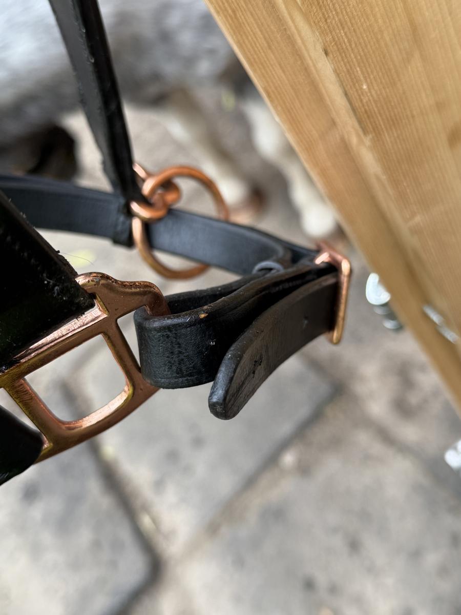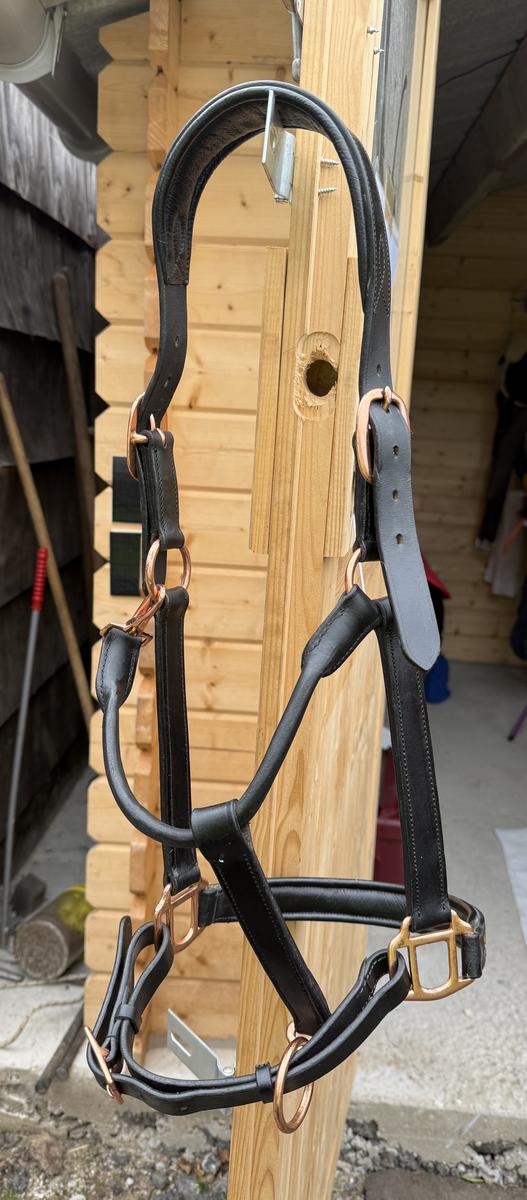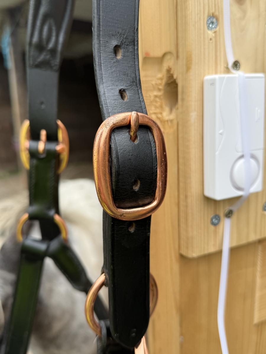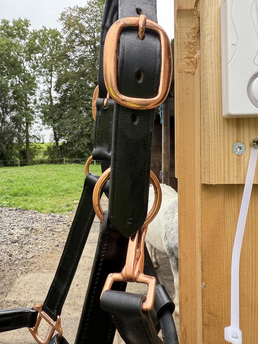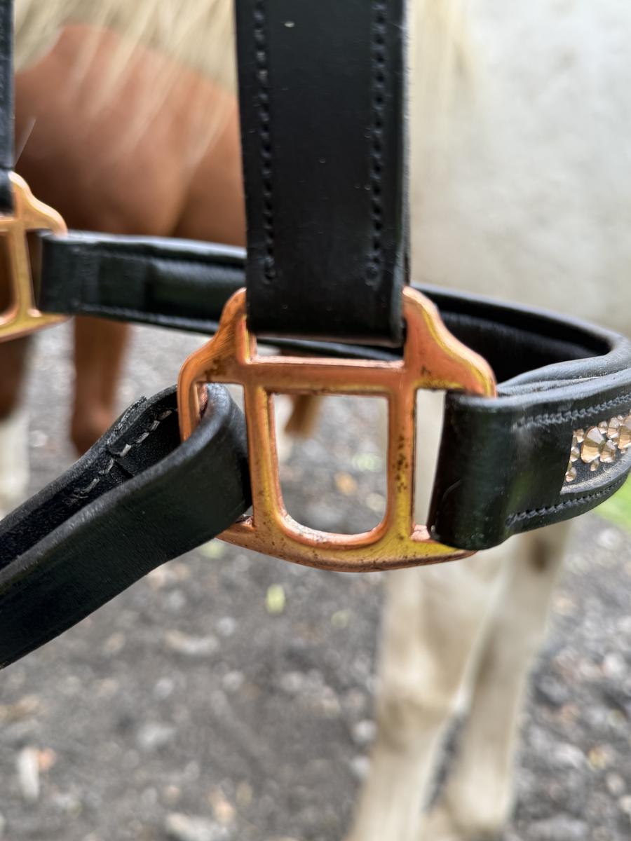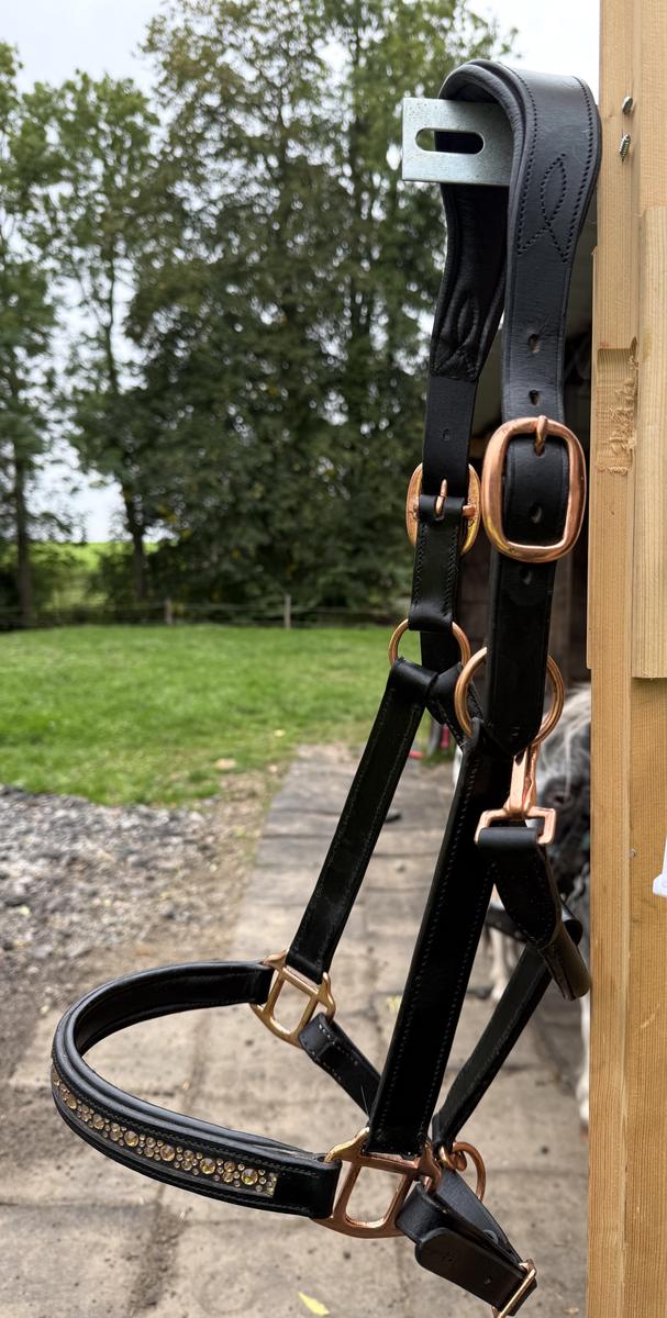 Licol en cuir noir, bouclerie et brillants de muserolle rose gold