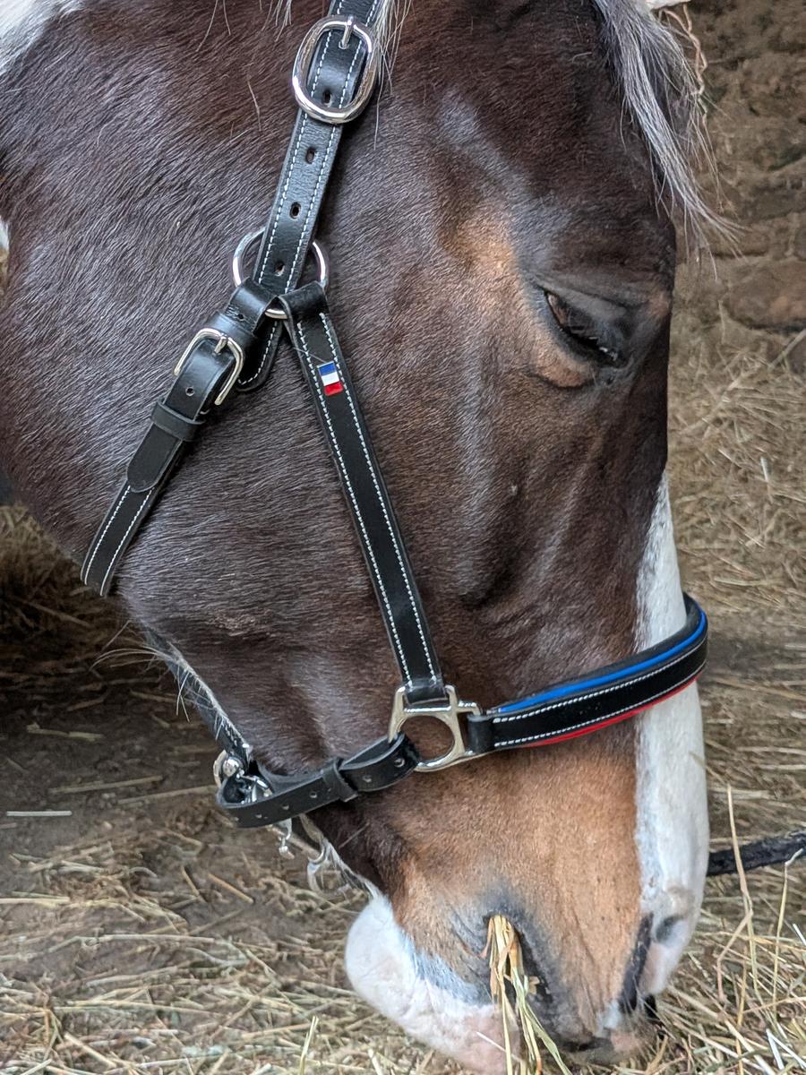 Licol cuir noir liserets bleu et rouge