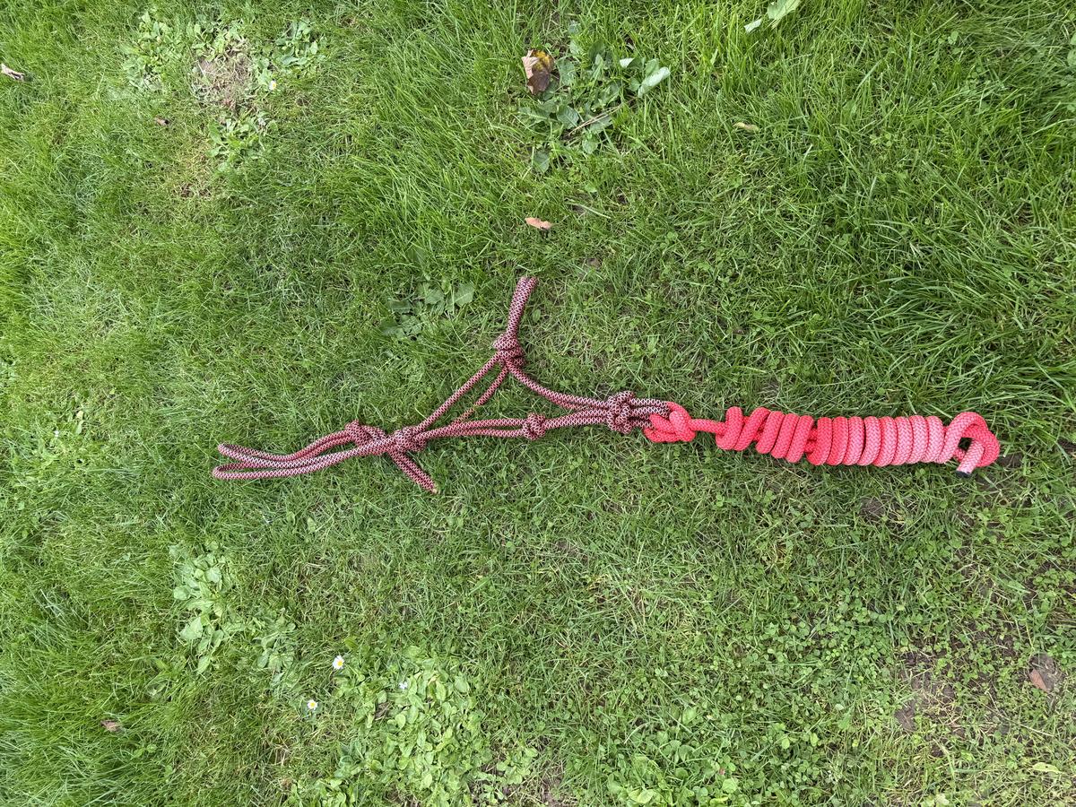 Vends licol éthologique + longe rouge, taille cheval. Il n'a jamais été utilisé mais la couleur est un peu passé.