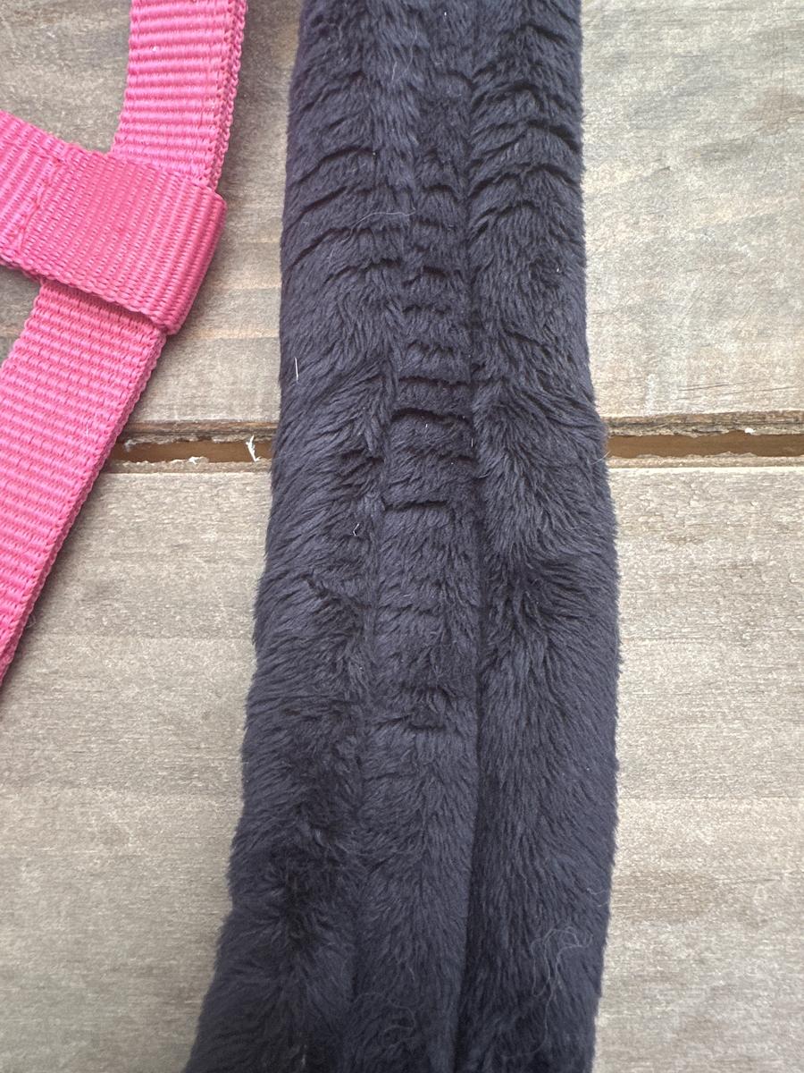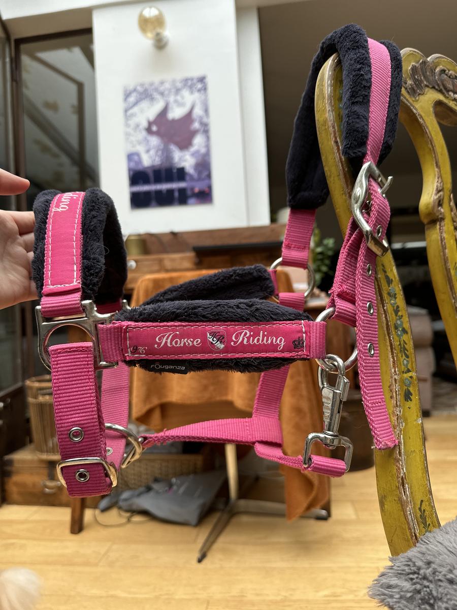 Licol taille poney rose avec moumoute bleu marine au niveau de la têtière, muserole et montants.