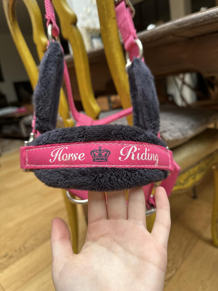 Licol taille poney rose avec moumoute bleu marine au niveau de la têtière, muserole et montants.