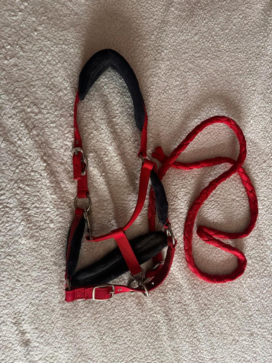Licol avec sa longe, couleur rouge et fausse fourrure de couleur grise foncée, taille cheval, marque Fouganza. Pas abîmé et propre. Peut avoir présence de poil.