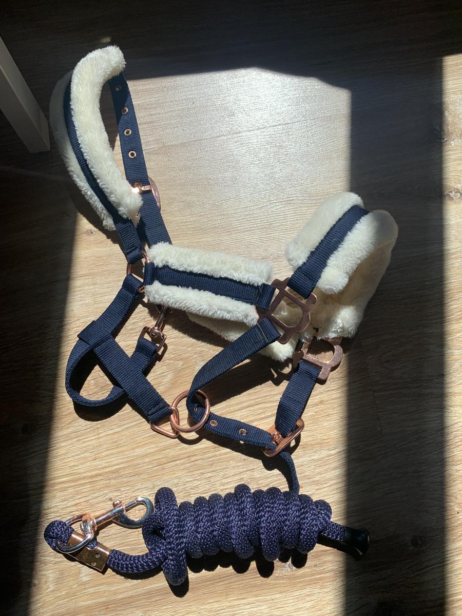 - licol bleu marine et rose gold avec fourrure blanche et avec sa longe. taille poney. très bon état (a dû servir 4/5 fois seulement