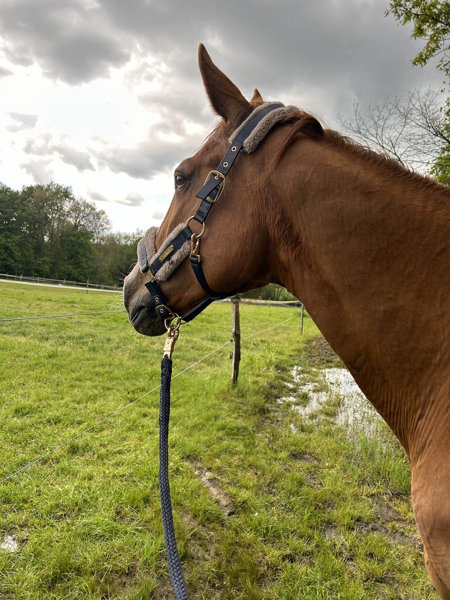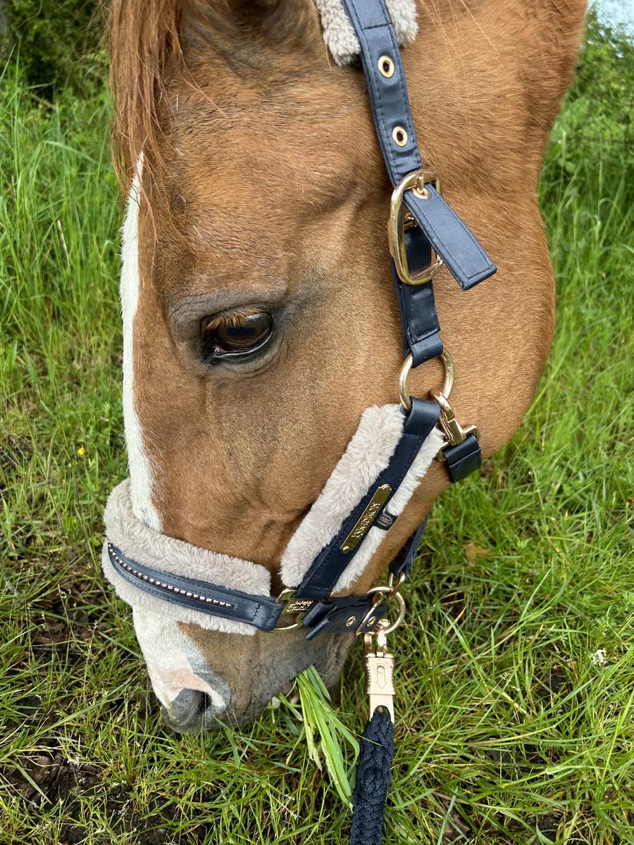ensemble licol et longe avec moumoute. ligne de strass sur la muserolle. bouclerie couleur rose gold.