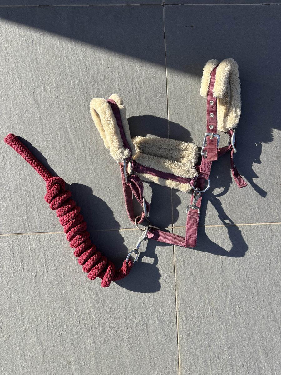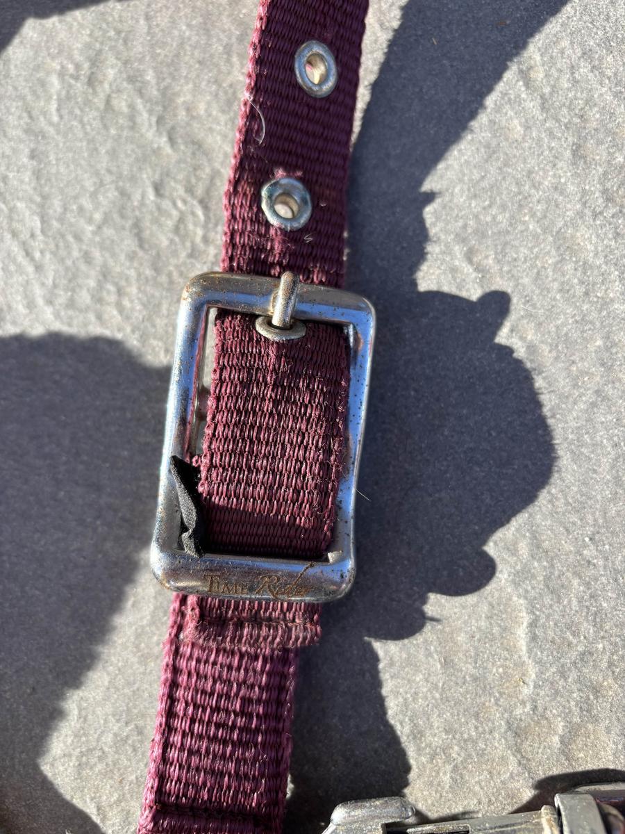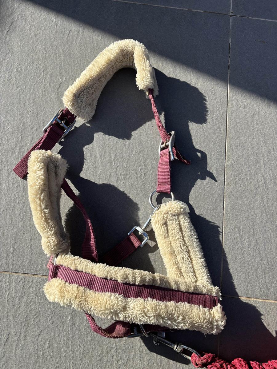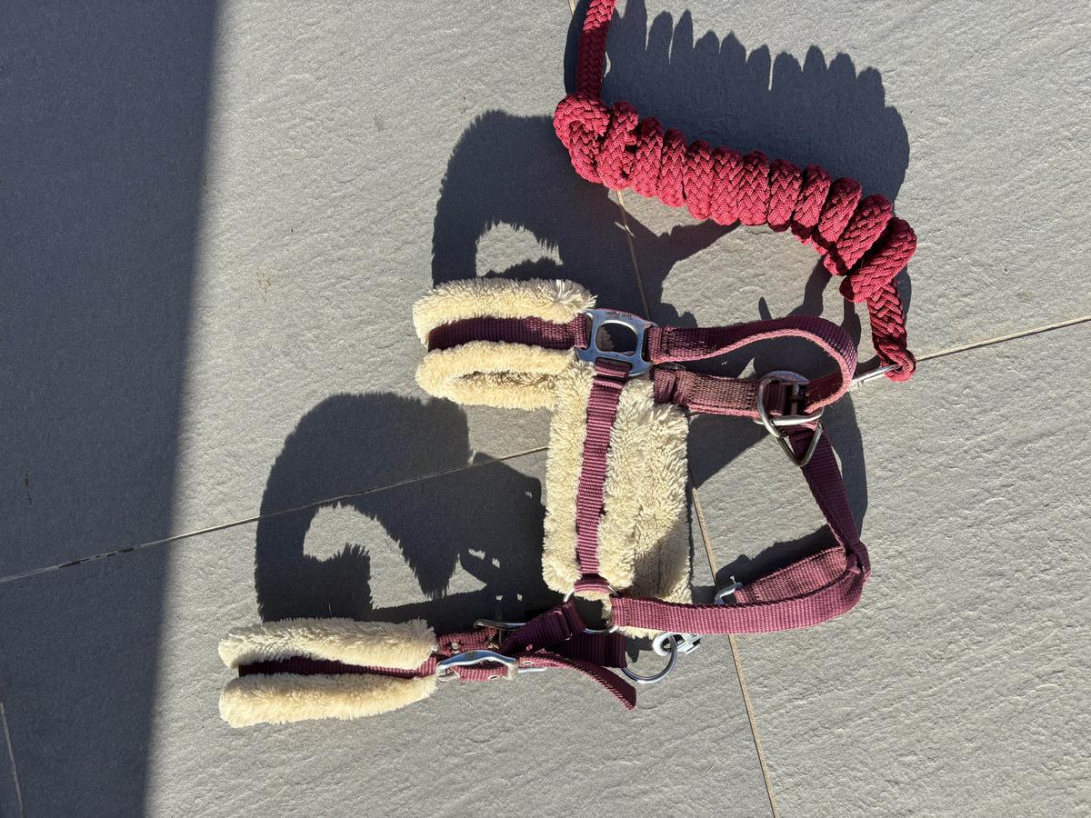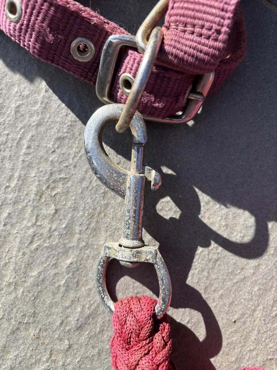 déjà porté, en très bon état. L’anneau de la longe et les boucles du licol sont légèrement rouillés mais l’anneau de la longe s’ouvre encore très bien.