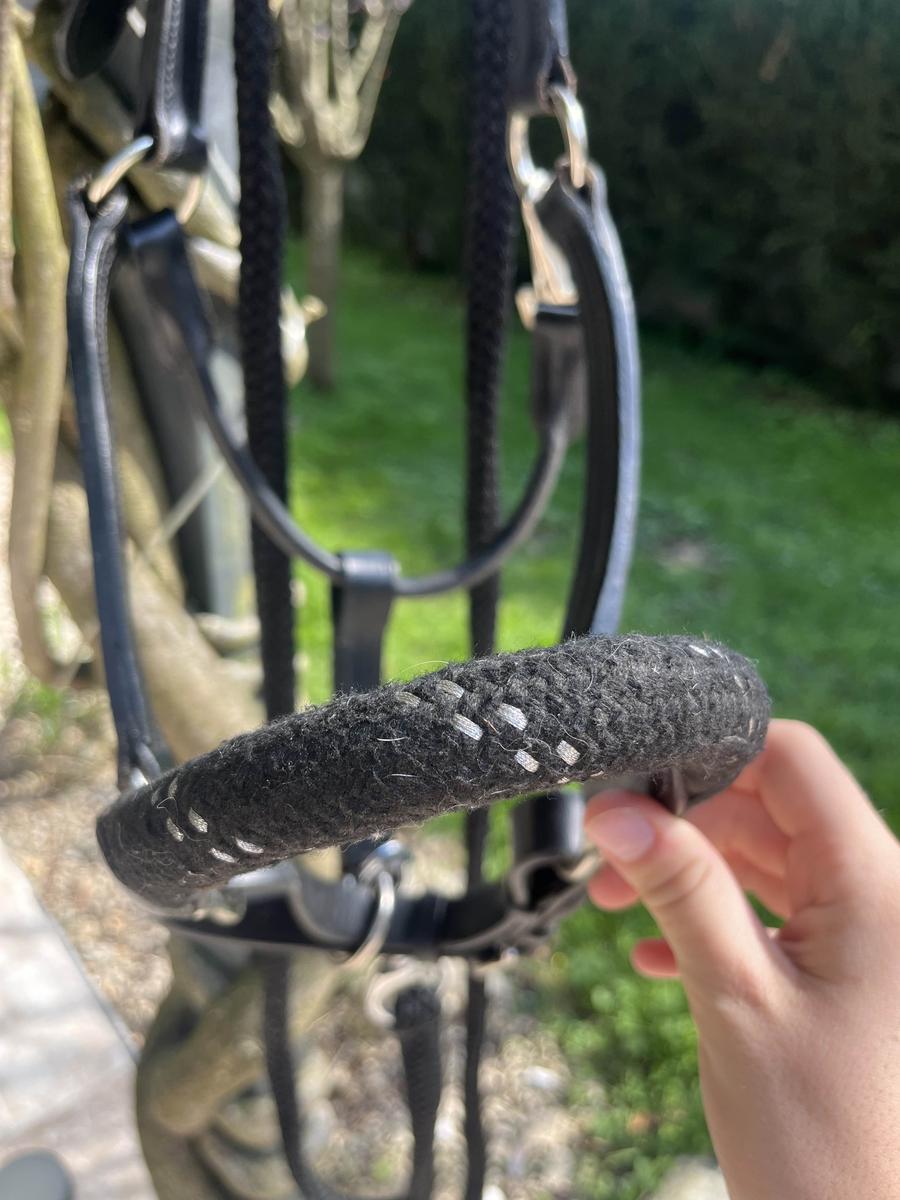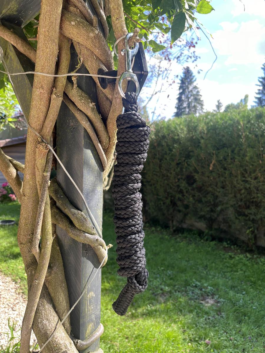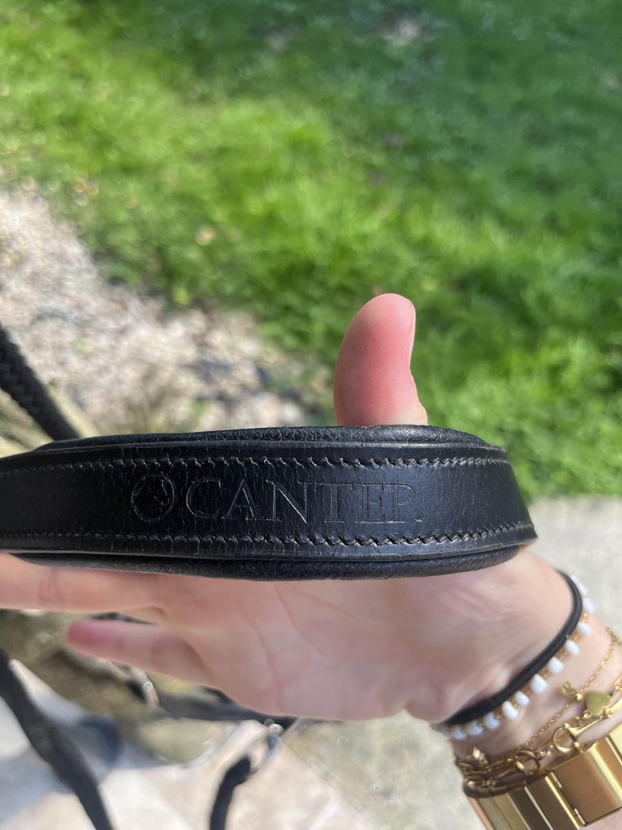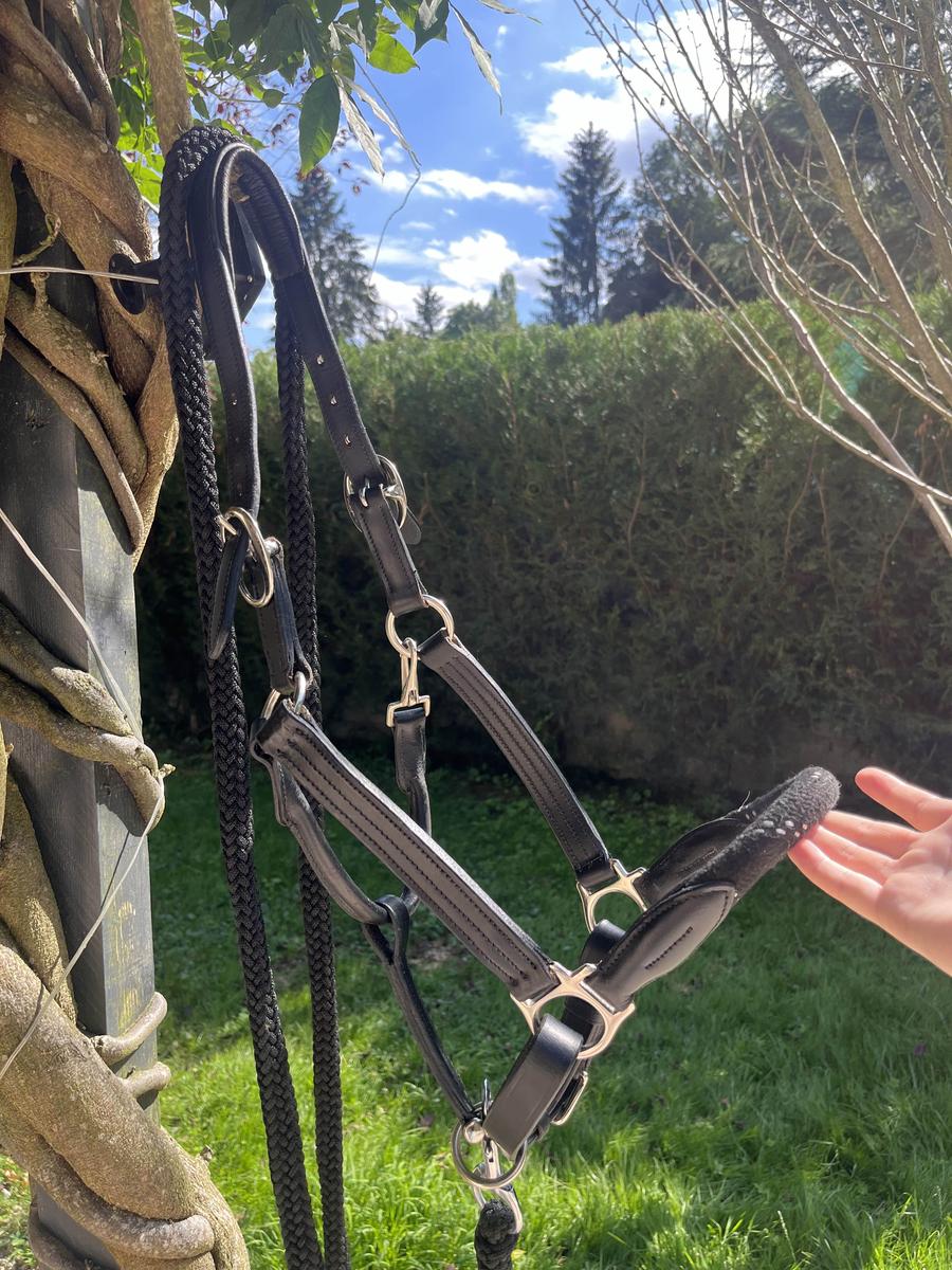licol en cuir et en corde de la marque canter, noir avec métal couleur argent.