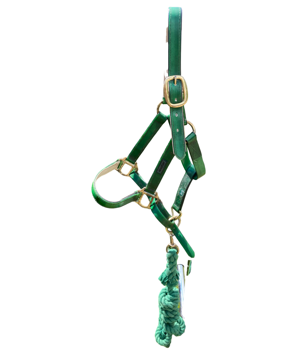 Licol vert matière plastique taille poney, vendu avec sa longe assortie, très bon état et facile à laver !