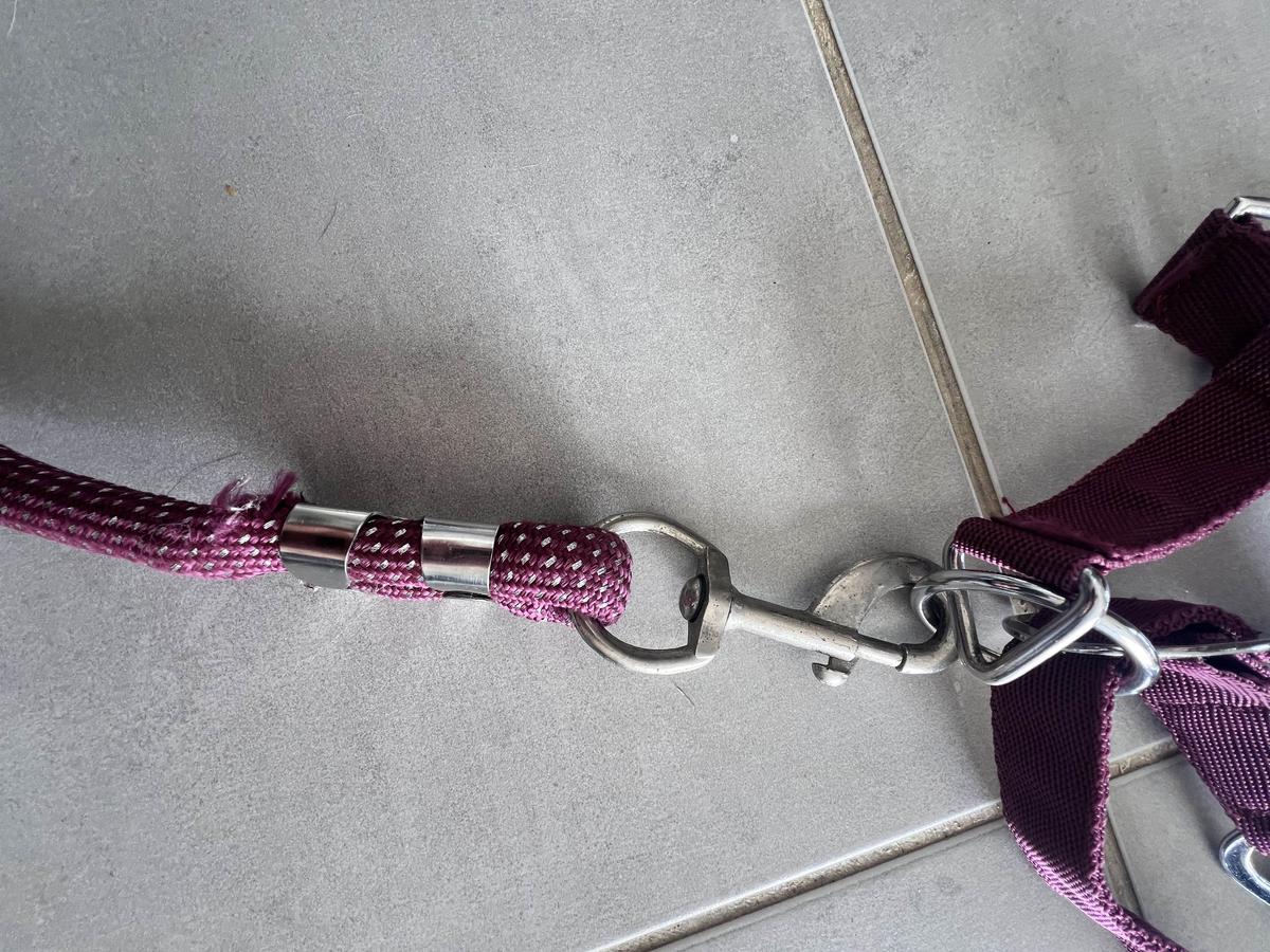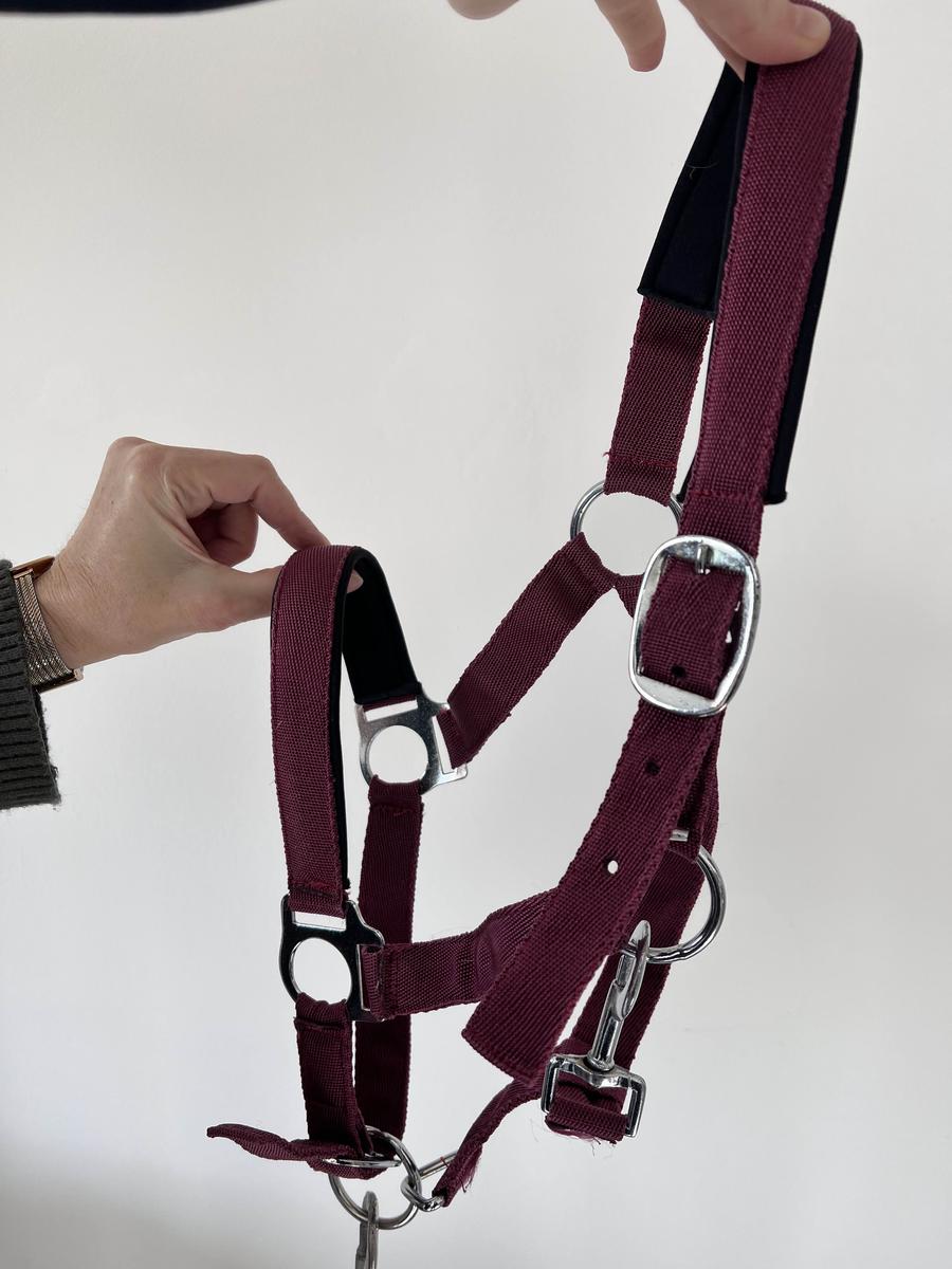 Vend licol taille poney de couleur prune, framboise avec une longe de la même couleur et des fils argentés.