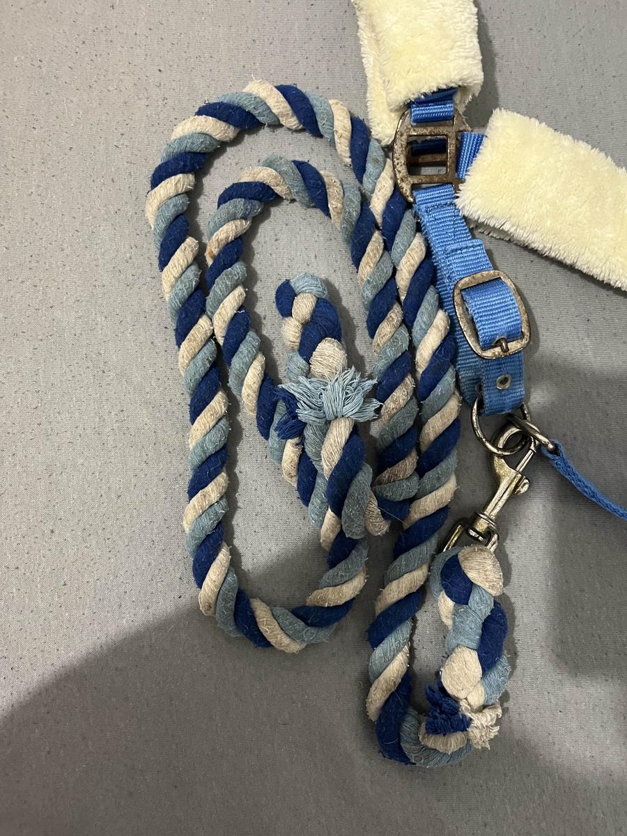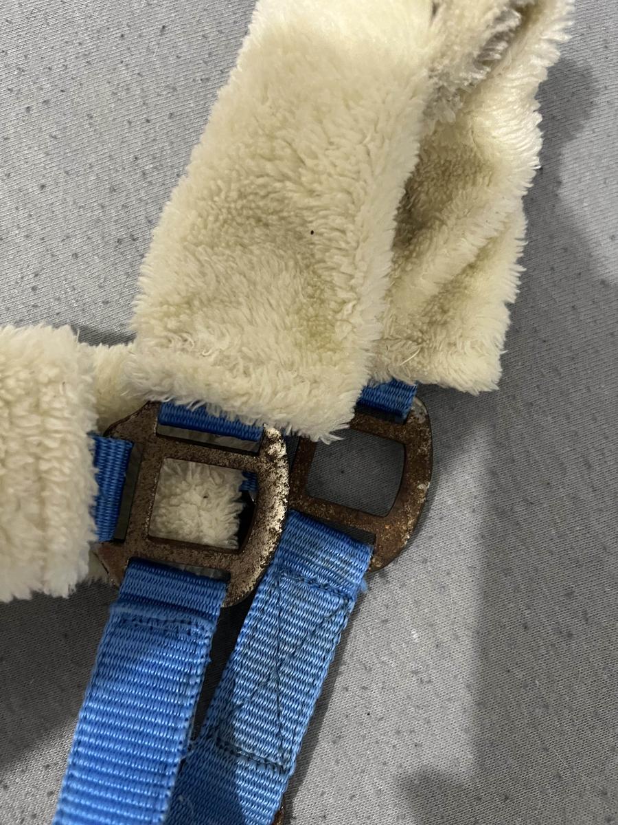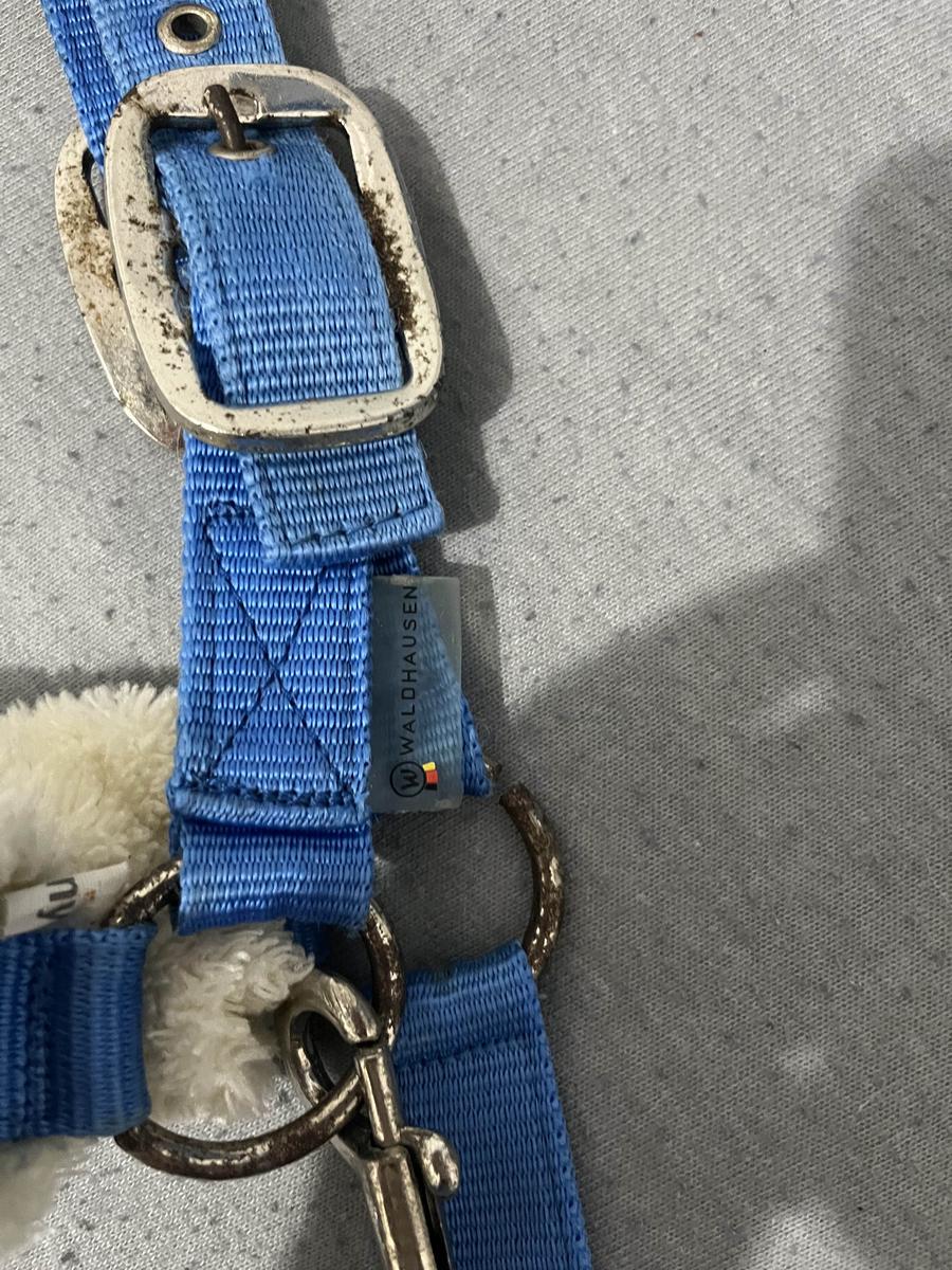 Licol bleu turquoise avec de la moumoute de la marque Waldhausen, vendu uniquement avec la longe, bouclerie rouillé mais peu encore servir ! Taille COB, défaut en image comme la rouille ou encore les taches sur la moumoute !