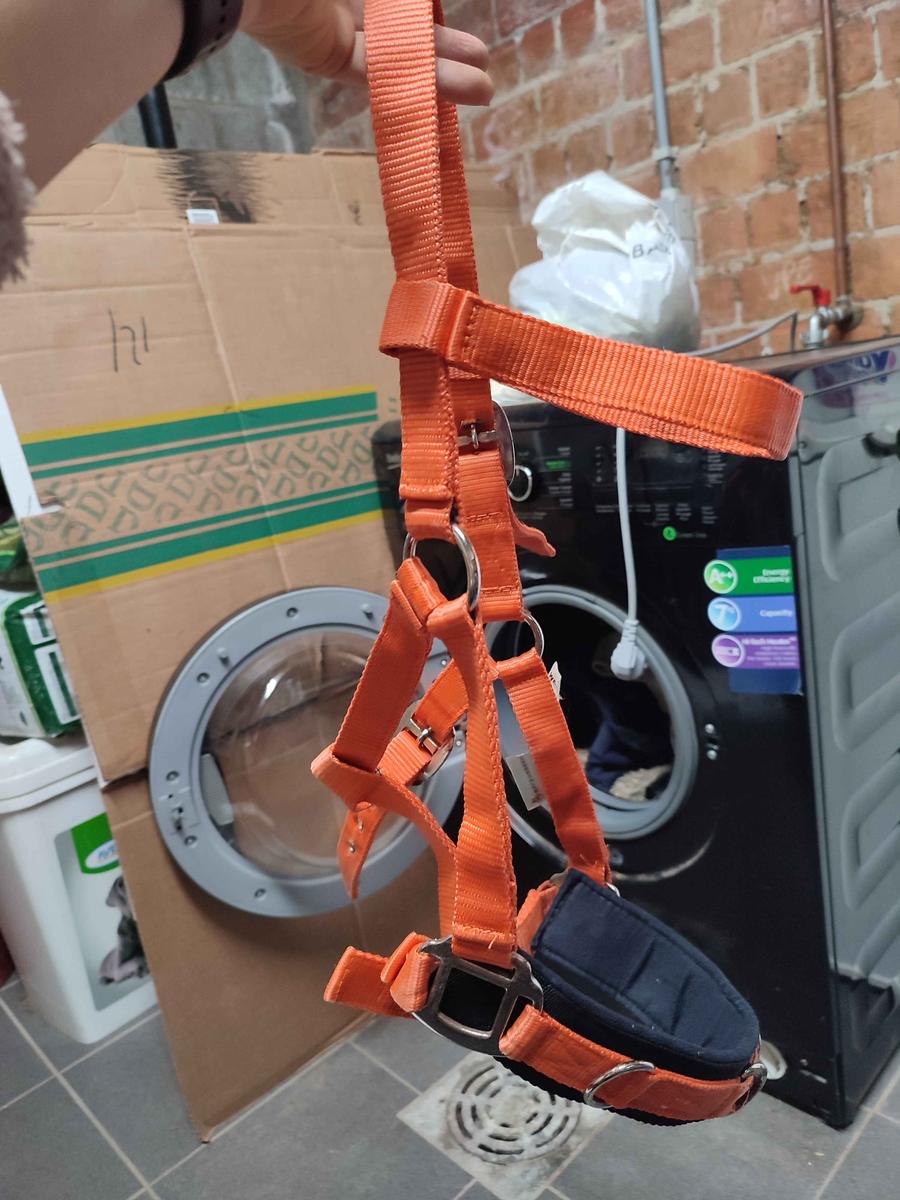 Caveçon taille cheval. Servi quelques semaines pour un débourrage. Réglable et plusieurs anneaux.