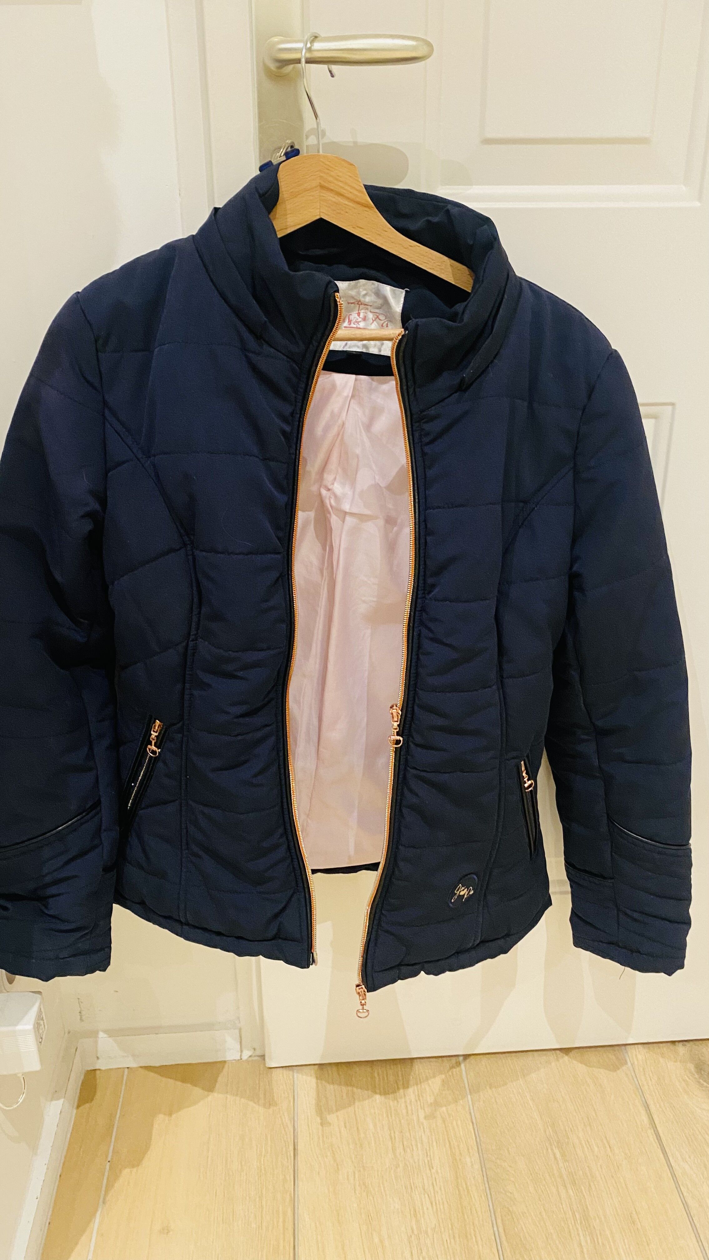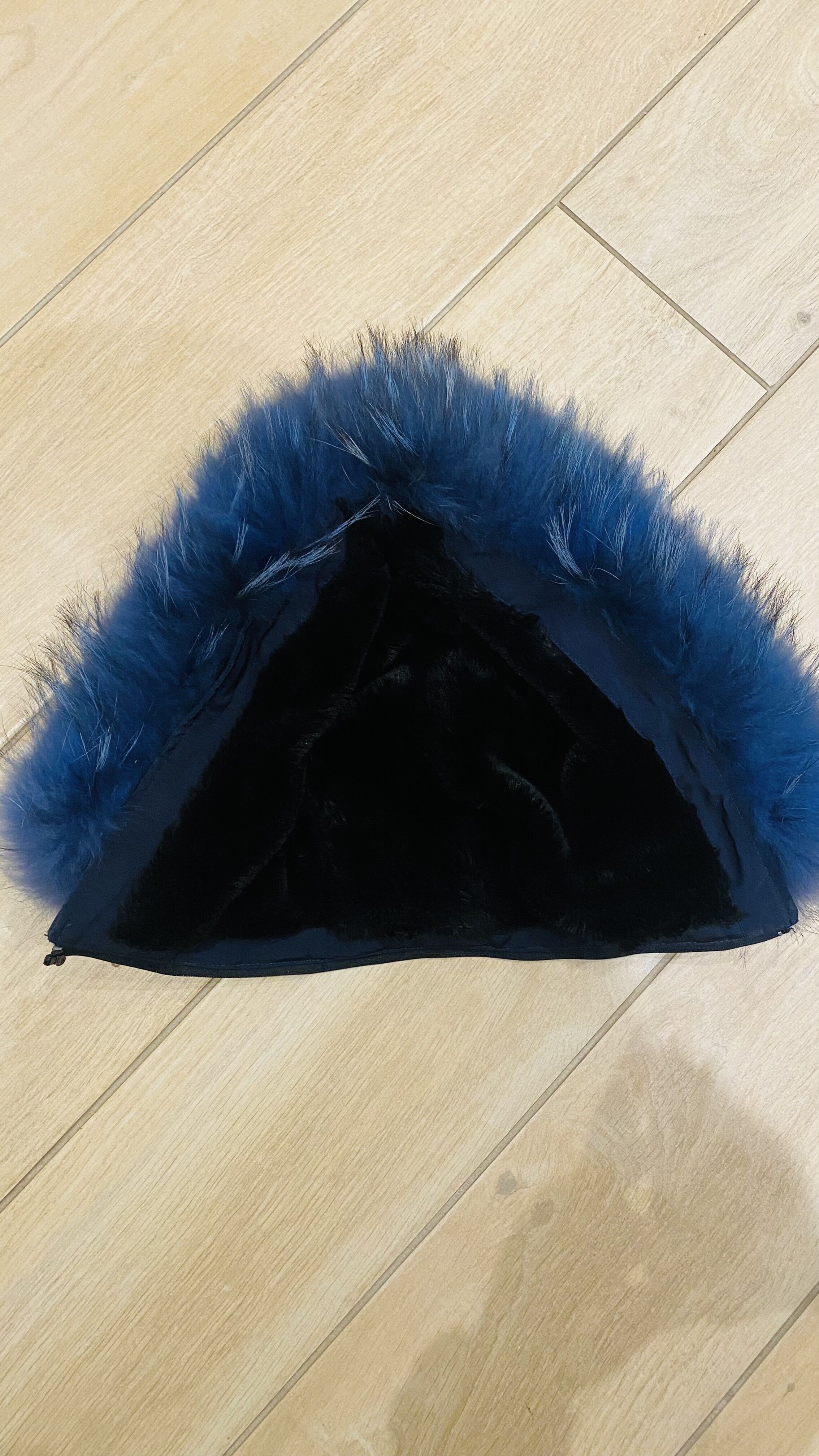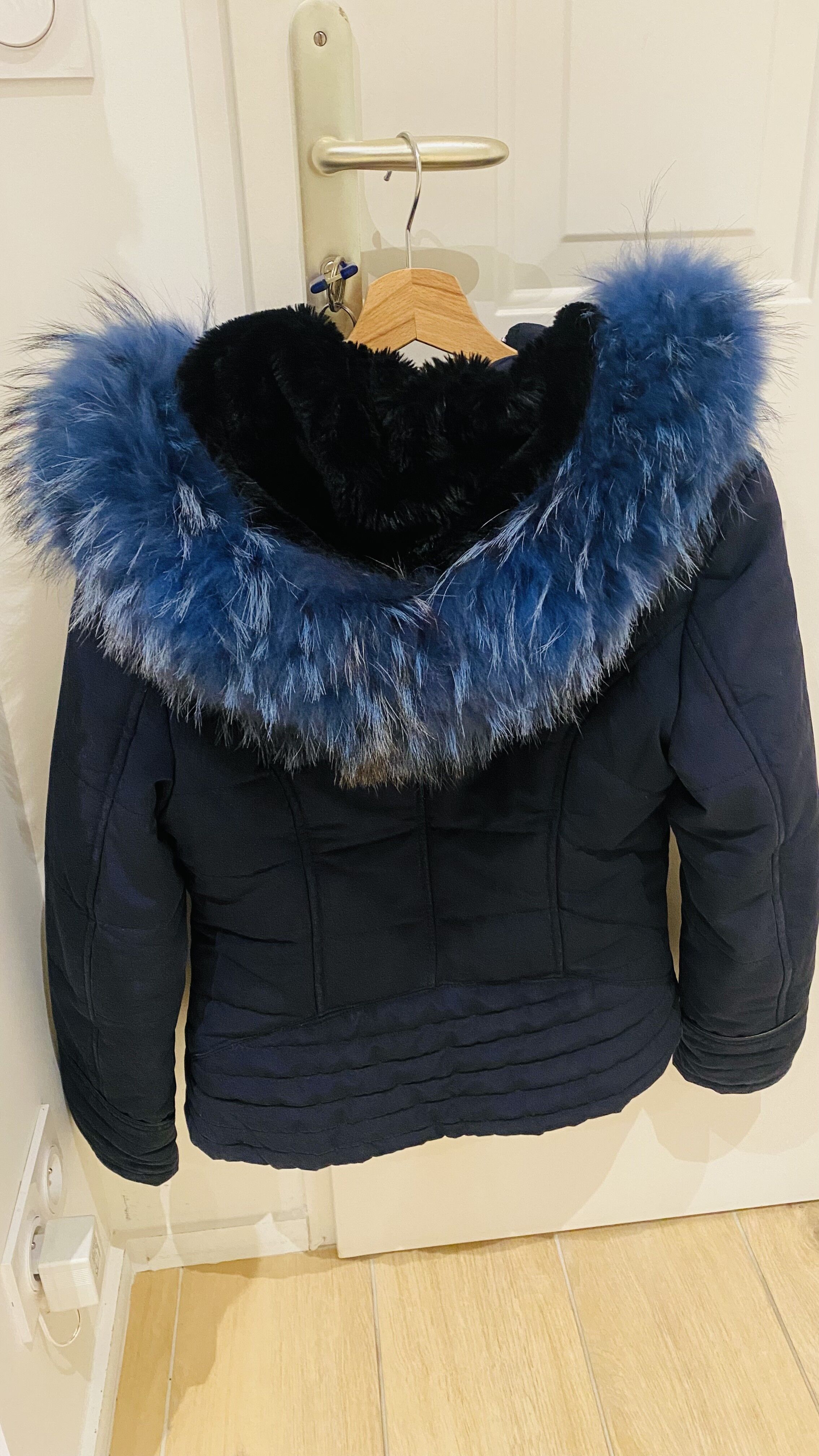 Veste d’hiver J’ai et Pa, tres bon état bleu marine avec capuche amovible et fausse fourrure amovible.