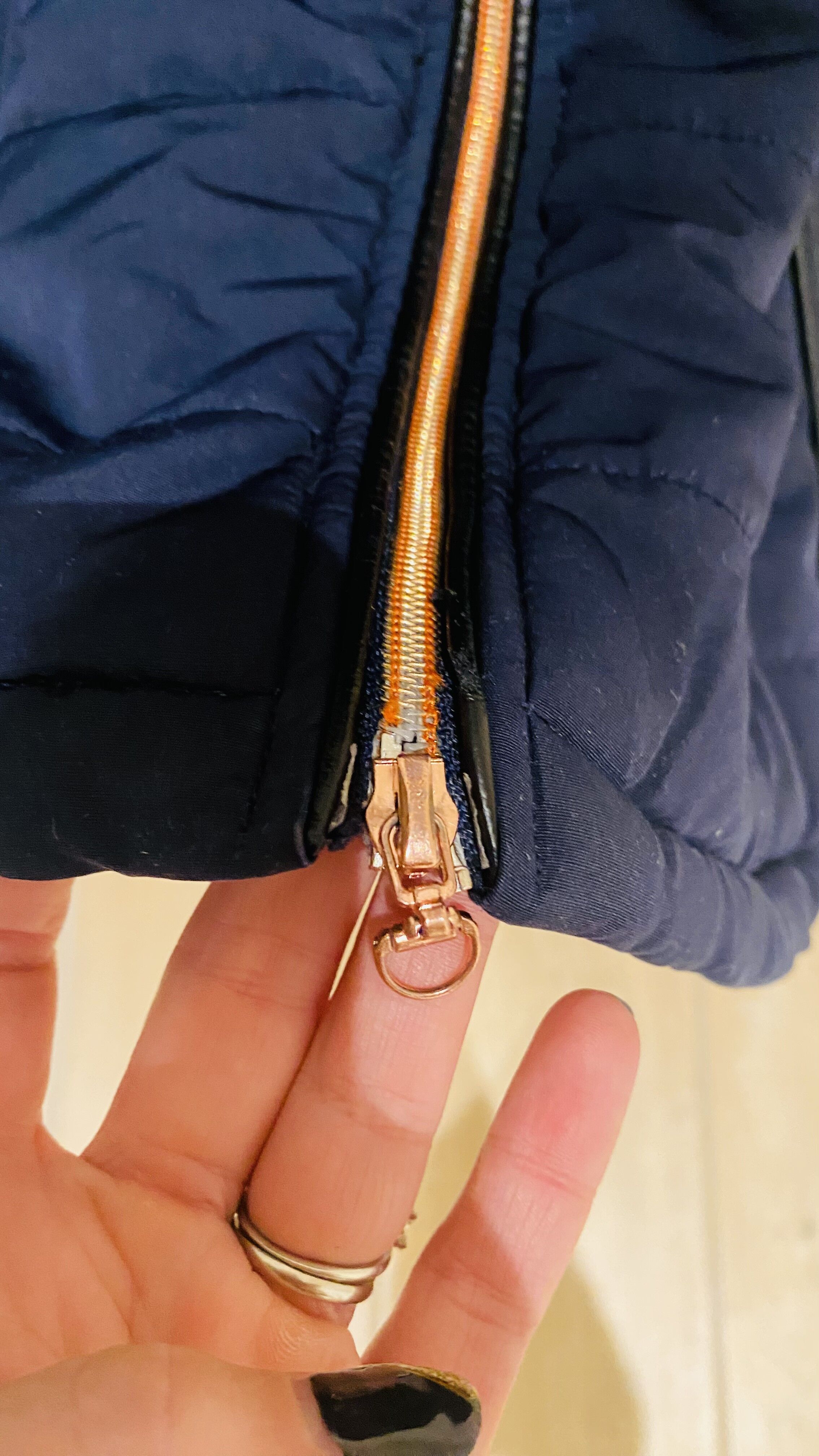 Les fermetures éclaire sont roses dorées,avec des étriers sur chaque zippees de fermeture. Double fermeture de la veste.