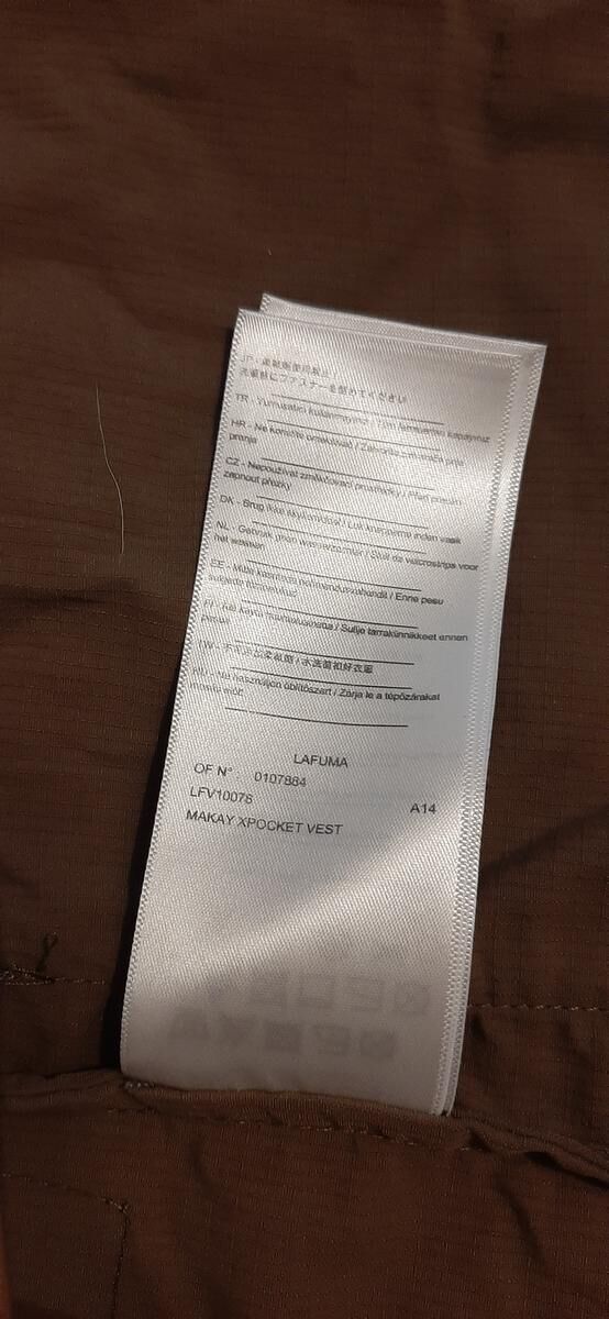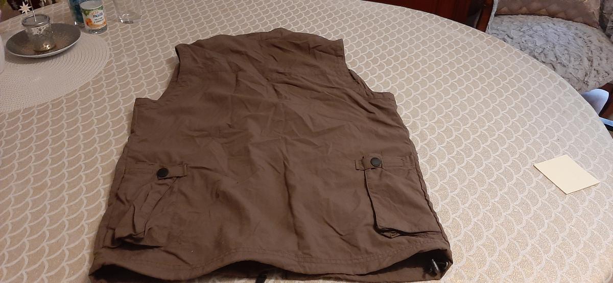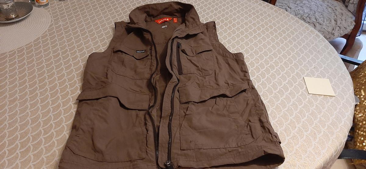 Veste lafuma multipoches que j utilisais en TREC. 2 poches à l arrière avec velcro et bouton pression et 4 poches devant , avec fermeture eclair. Fermeture éclair simple pour fermer la veste . Pas de poche à l intérieur. Petite tache d encre sur poche du bas gauche. Coloris kaki UPF 30.hauteur 64cm. Largeur épaules 38cm