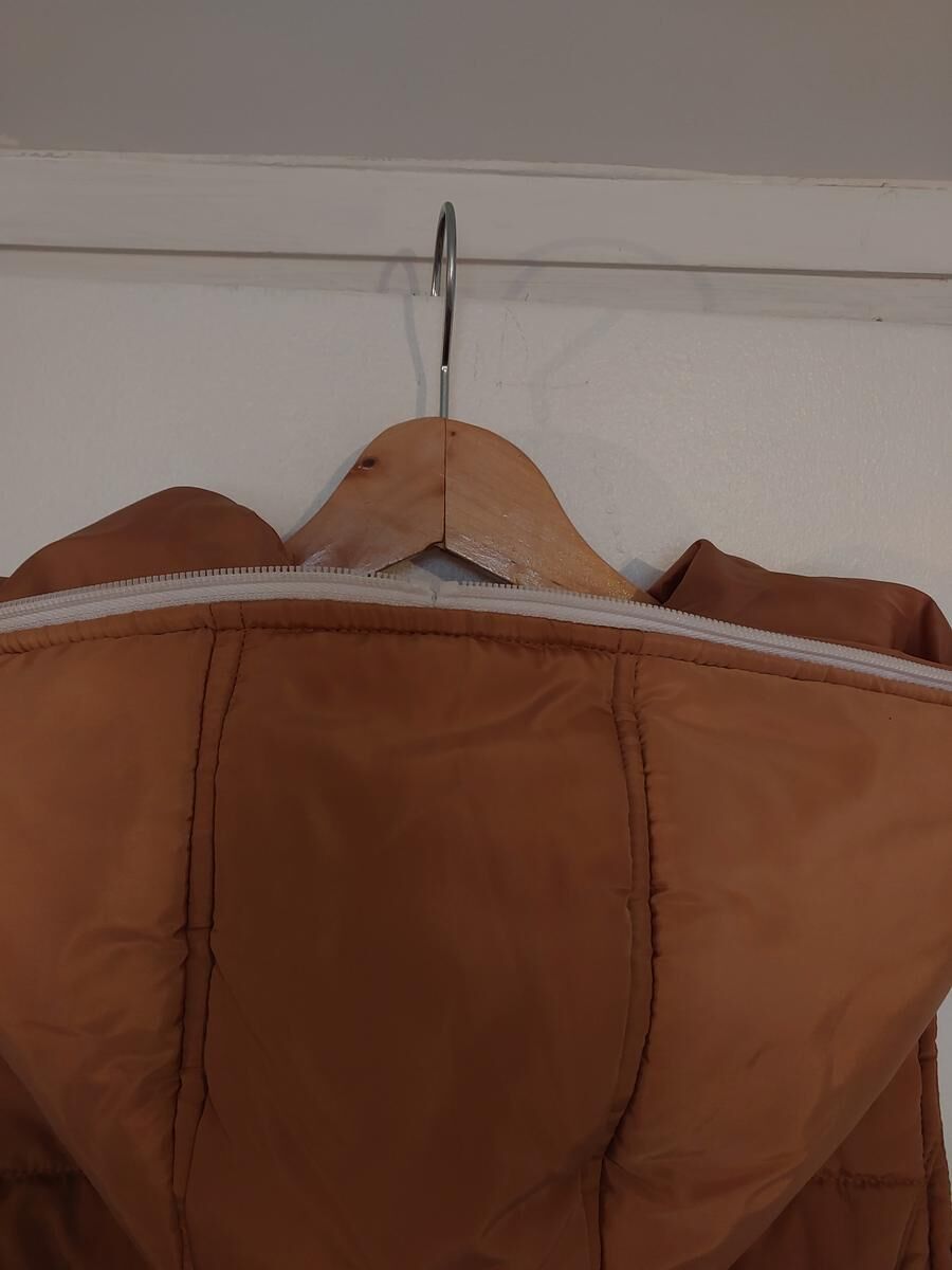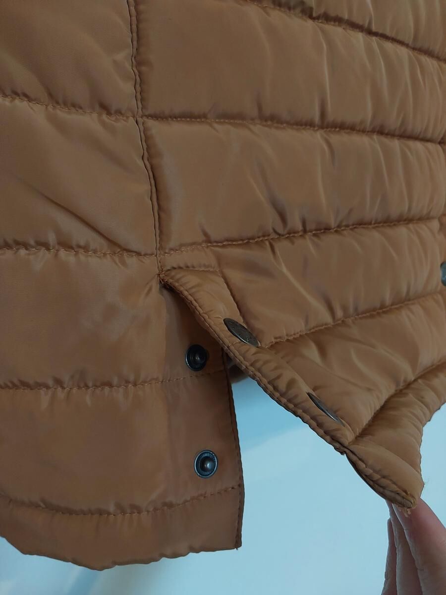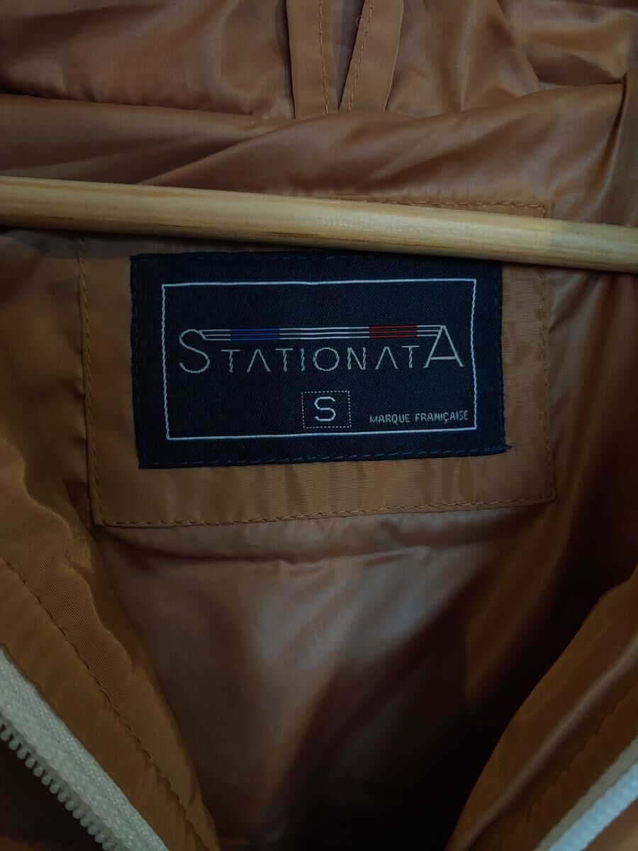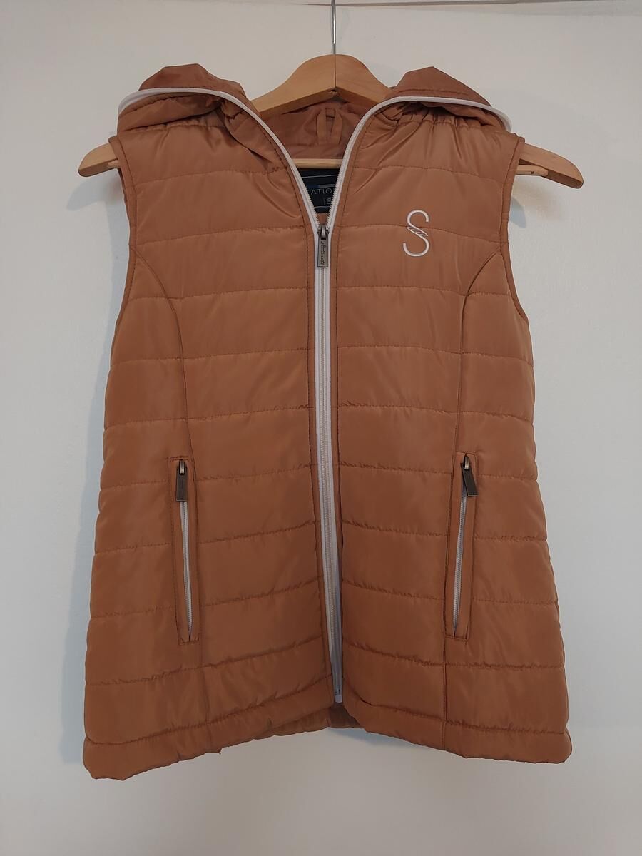 Doudoune sans manches Stationata. Couleur camel. Grande fermeture éclair qui peut aller jusqu'au bout de la capuche. Deux poches avec fermeture éclair également. Logo de la marque sur la poitrine à gauche. Possibilité de déboutonner quatre boutons à l'arrière afin de ne pas être gêné à cheval. Portée une dizaine de fois, donc très bon état. Taille S. Prix neuf : 55€.