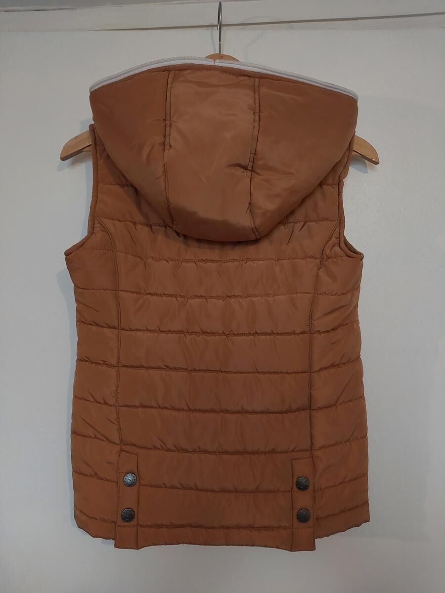 Doudoune sans manches Stationata. Couleur camel. Grande fermeture éclair qui peut aller jusqu'au bout de la capuche. Deux poches avec fermeture éclair également. Logo de la marque sur la poitrine à gauche. Possibilité de déboutonner quatre boutons à l'arrière afin de ne pas être gêné à cheval. Portée une dizaine de fois, donc très bon état. Taille S. Prix neuf : 55€.