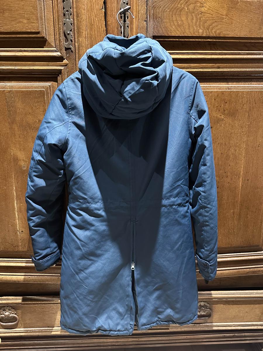 Doudoune longue B Vertigo, taille 34, bleue canard, excellent état, quasiment peu portée. Très bien pour monter à cheval car ouverture derrière.