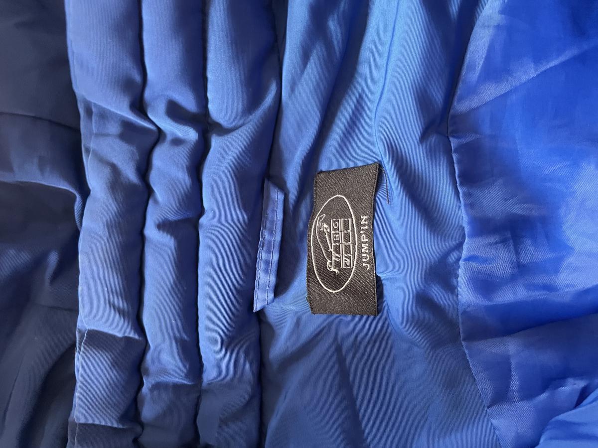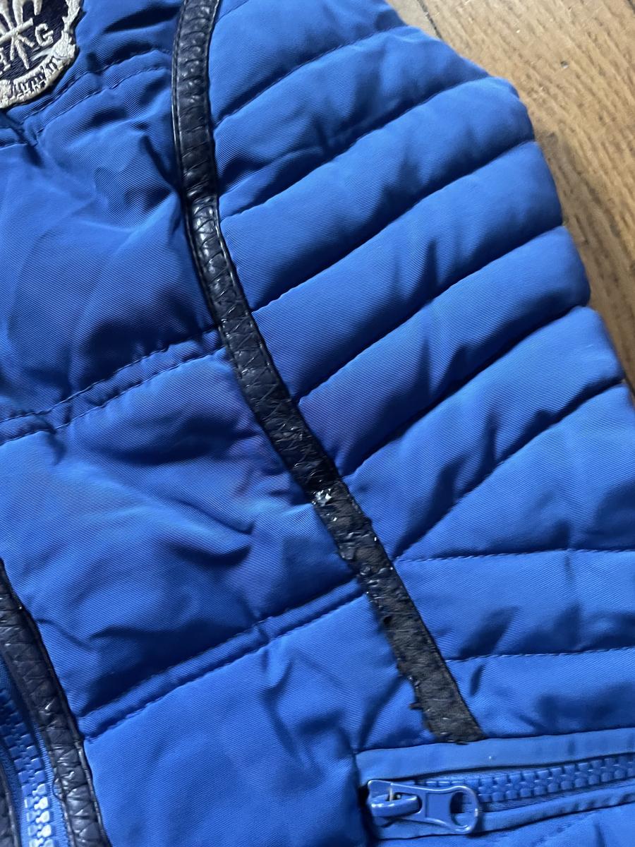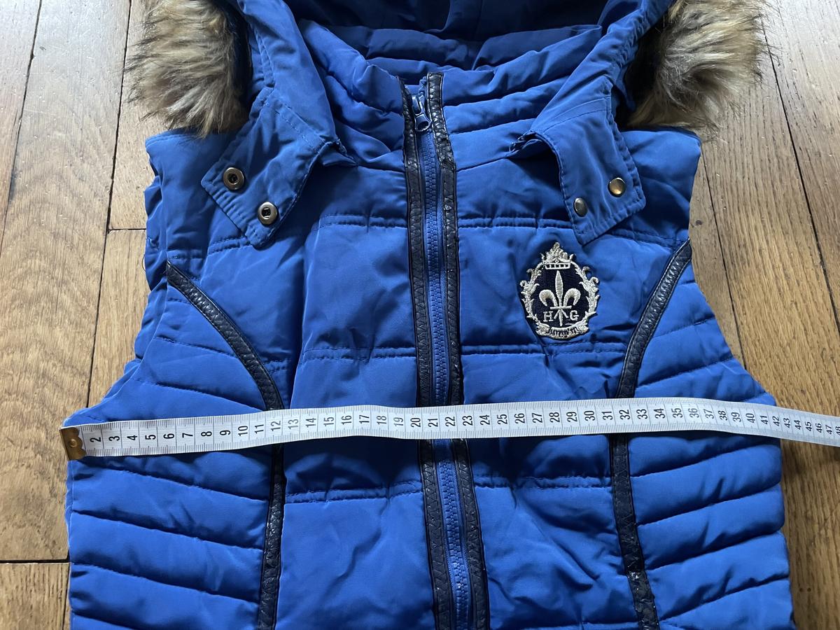 Doudoune sans manche équitation cheval poney bleu roi logo fleur de lys hg Hervé Godignon taille S/36 capuche amovible fausse fourrure similicuir abîmé à un endroit hg