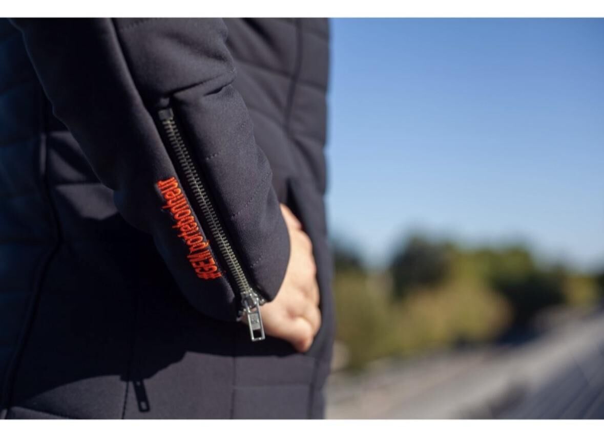 Manteau GEM taille L noir/bleu marine foncé, détails orange.