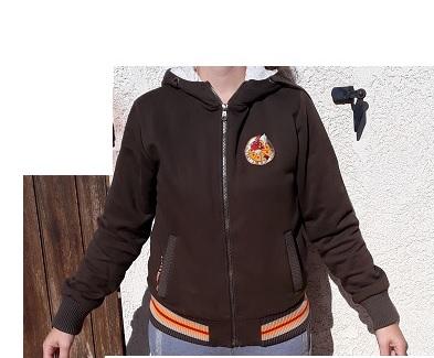 Fermeture par zip, poches droites. Badge poitrine et impression au bas, patchs avec broderie au dos.