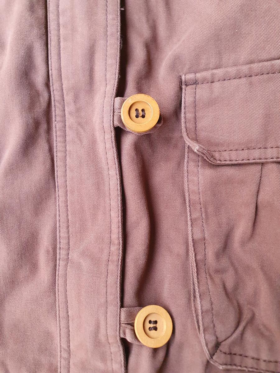 Fermeture à glissière double sens toute hauteur avec rabat à gros boutons en bois.