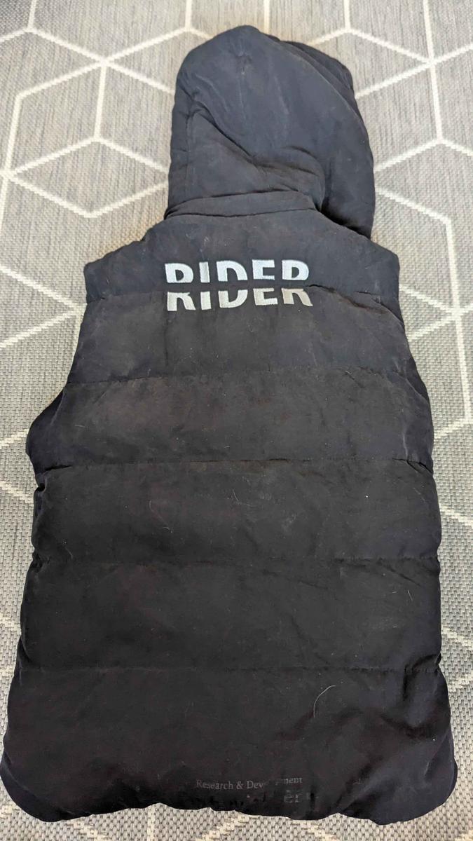 je vends cette veste sans manche equitheme bleu, taille s. avec écriture rider dans le dos, je l'adore mais je ne rentre plus dedans, sera lavée pour la vente.