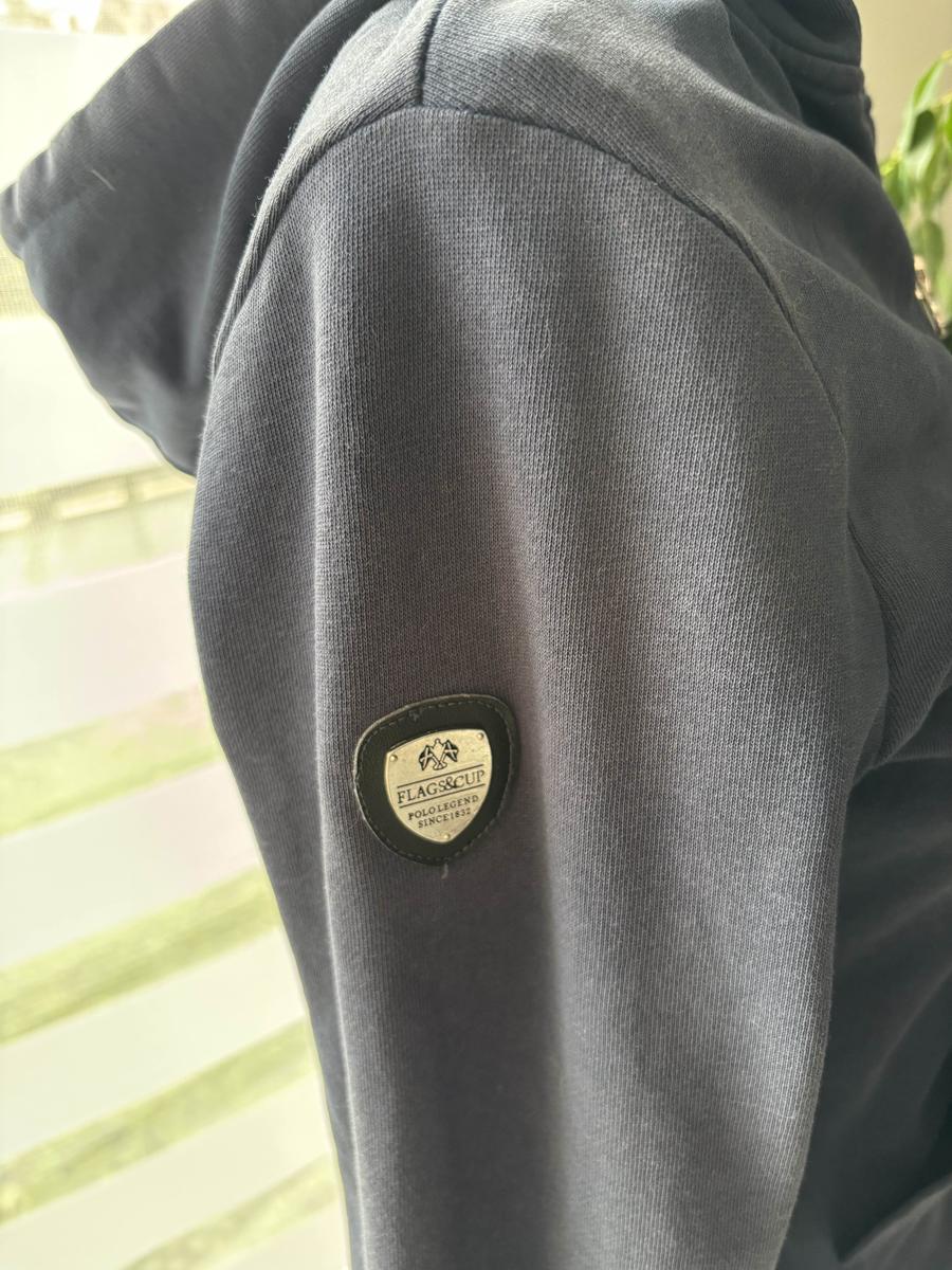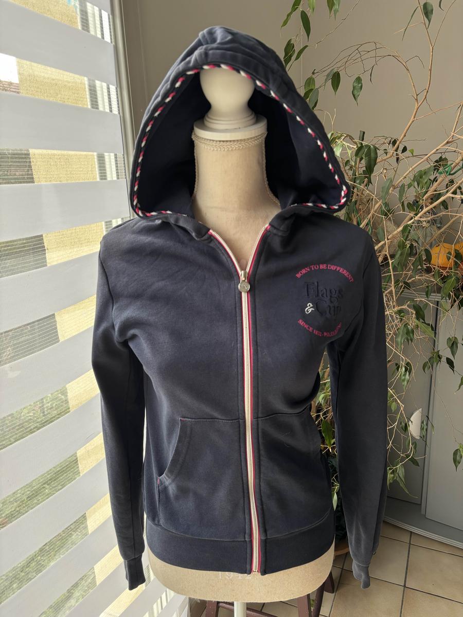 Veste type sweat zippé Flags & Cup en taille S, couleur bleu marine avec détails rose, en très bon état, très peu portée. Idéale pour l'équitation ou un style sportif/chic au quotidien. Matière confortable, coupe féminine, fermeture zippée solide et finitions soignées.