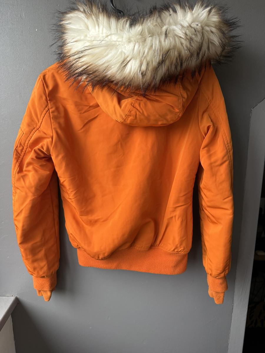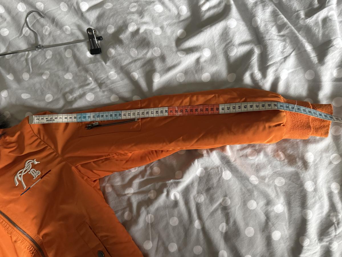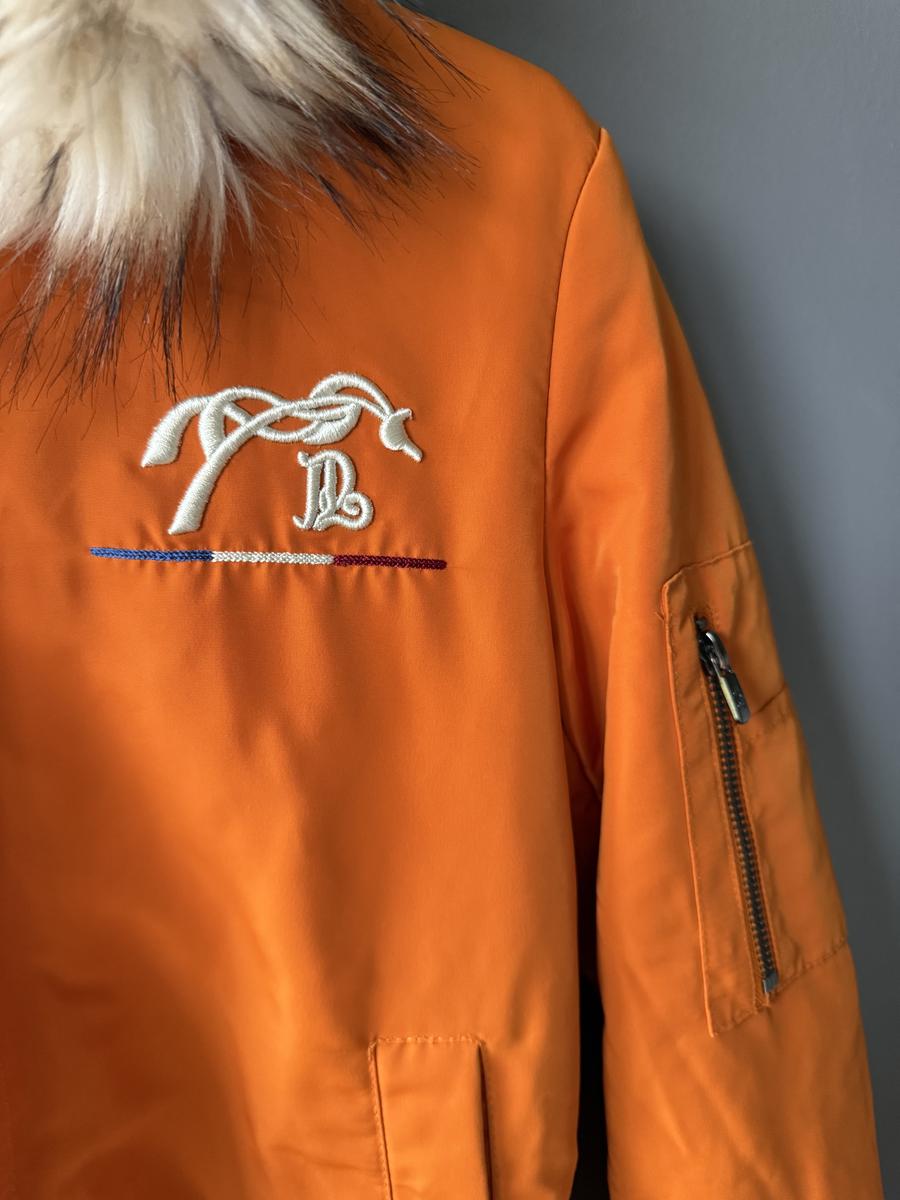 Bomber veste cheval poney équitation doudoune Lyon - orange beige crème capuche fourrure fausse moumoute Pénélope leprevost taille 14/16ans XS/S qu’elle que traces voir photos