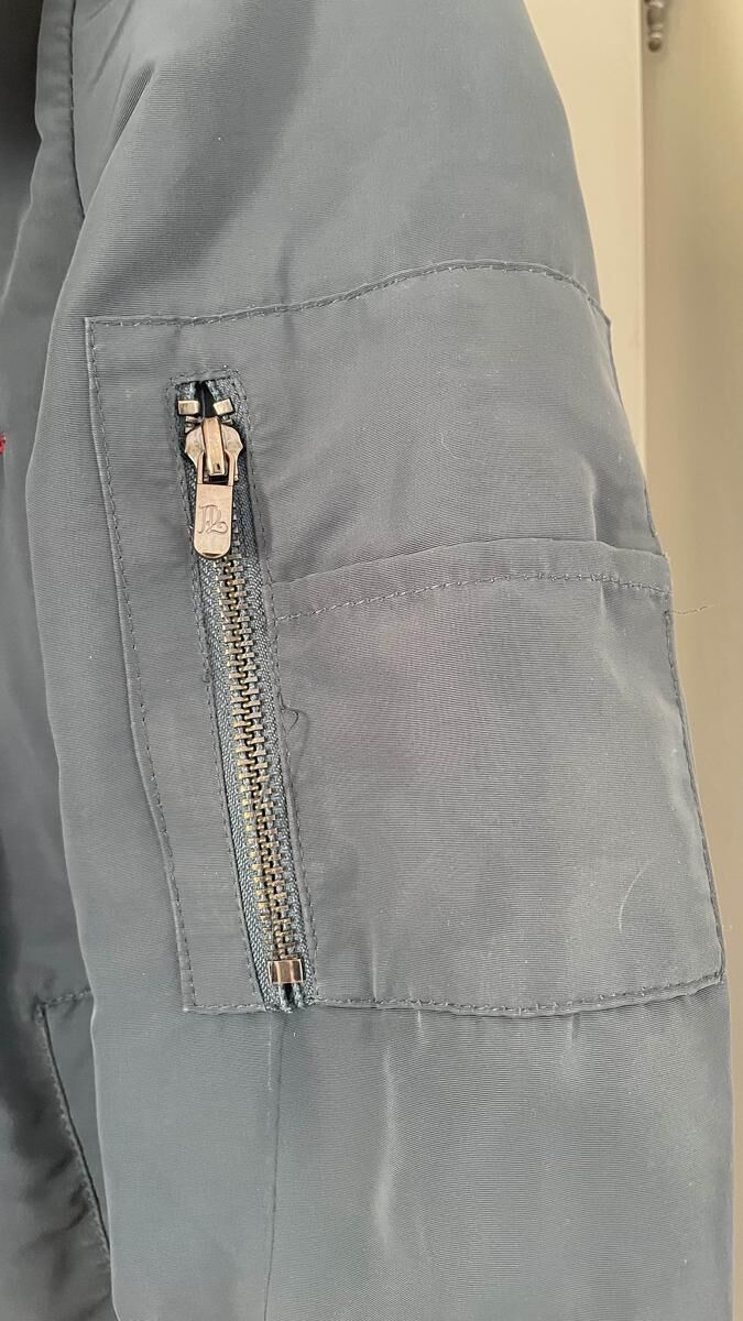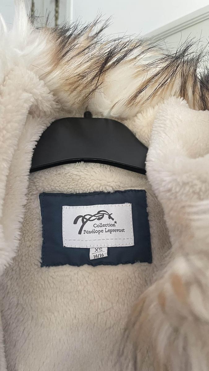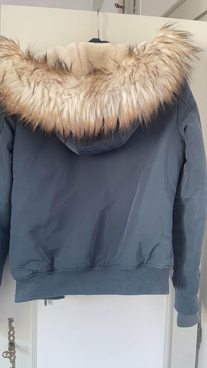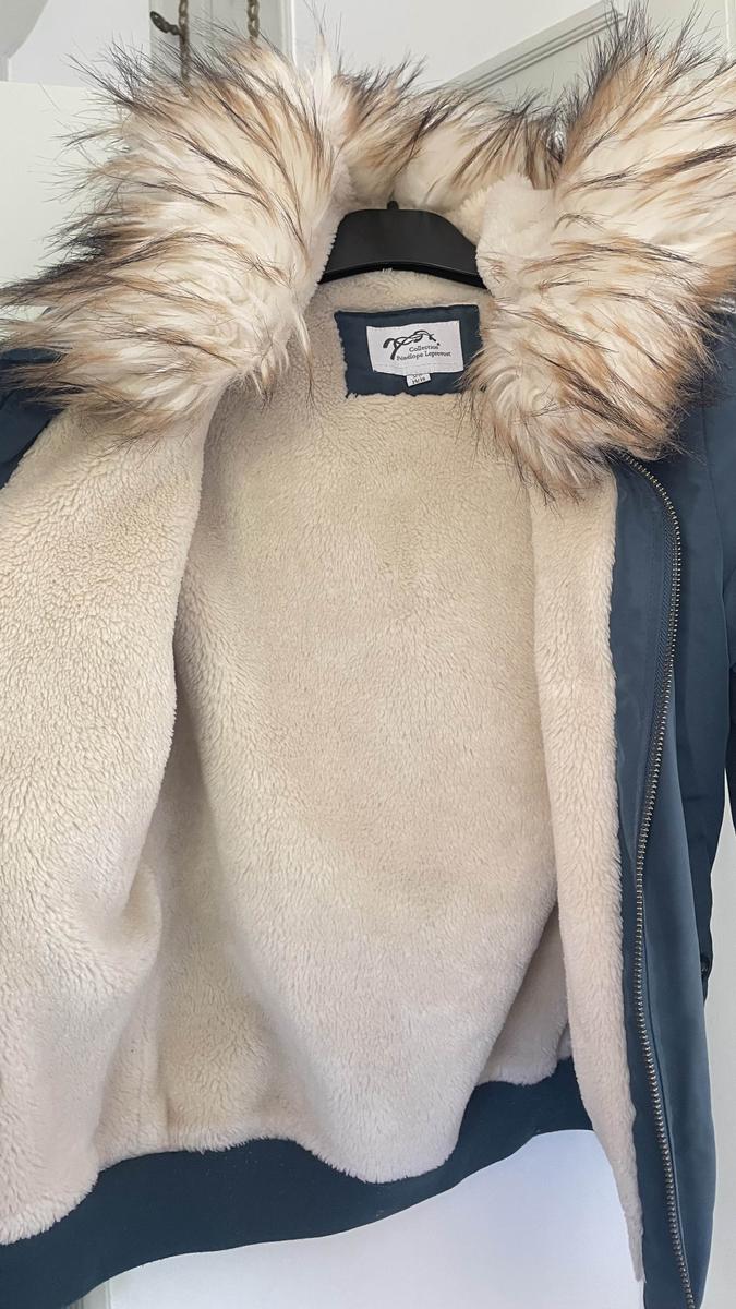 couleur : bleu canard doudoune Penelope, dans un très bon état, hormis une petite tache à l’avant gauche Fourrure et polaire intérieur impeccable Très bien pour l’hiver emplacement pour mettre le pouce au niveau des manches, matière un peu élastique et plus serré pour protéger du froid
