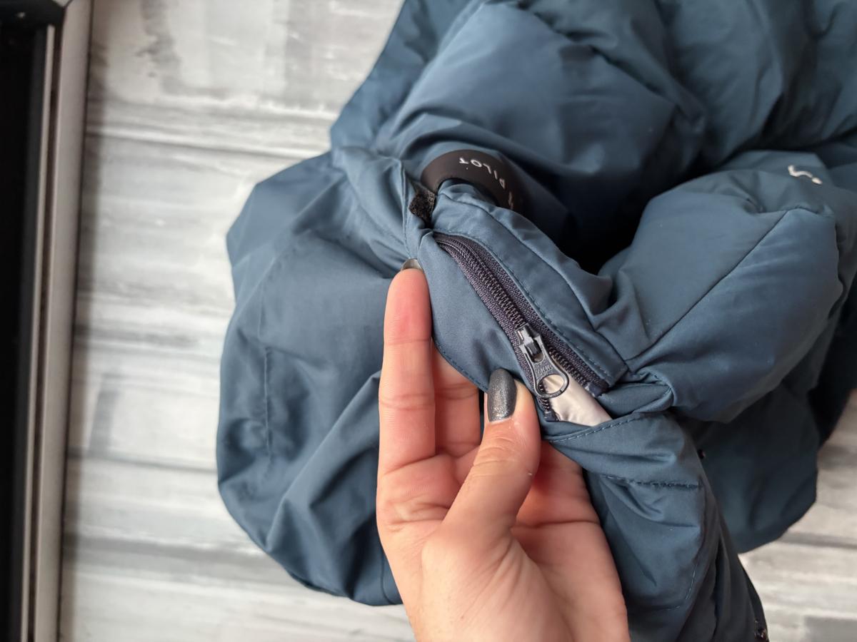 Une poche à l’intérieur ainsi que deux poches sur le côté qui se ferme avec des pressions