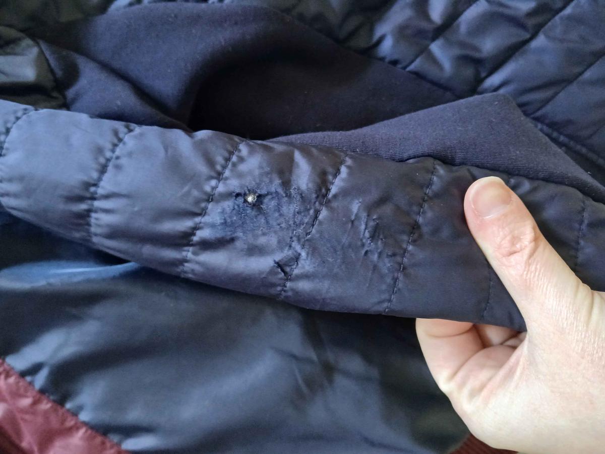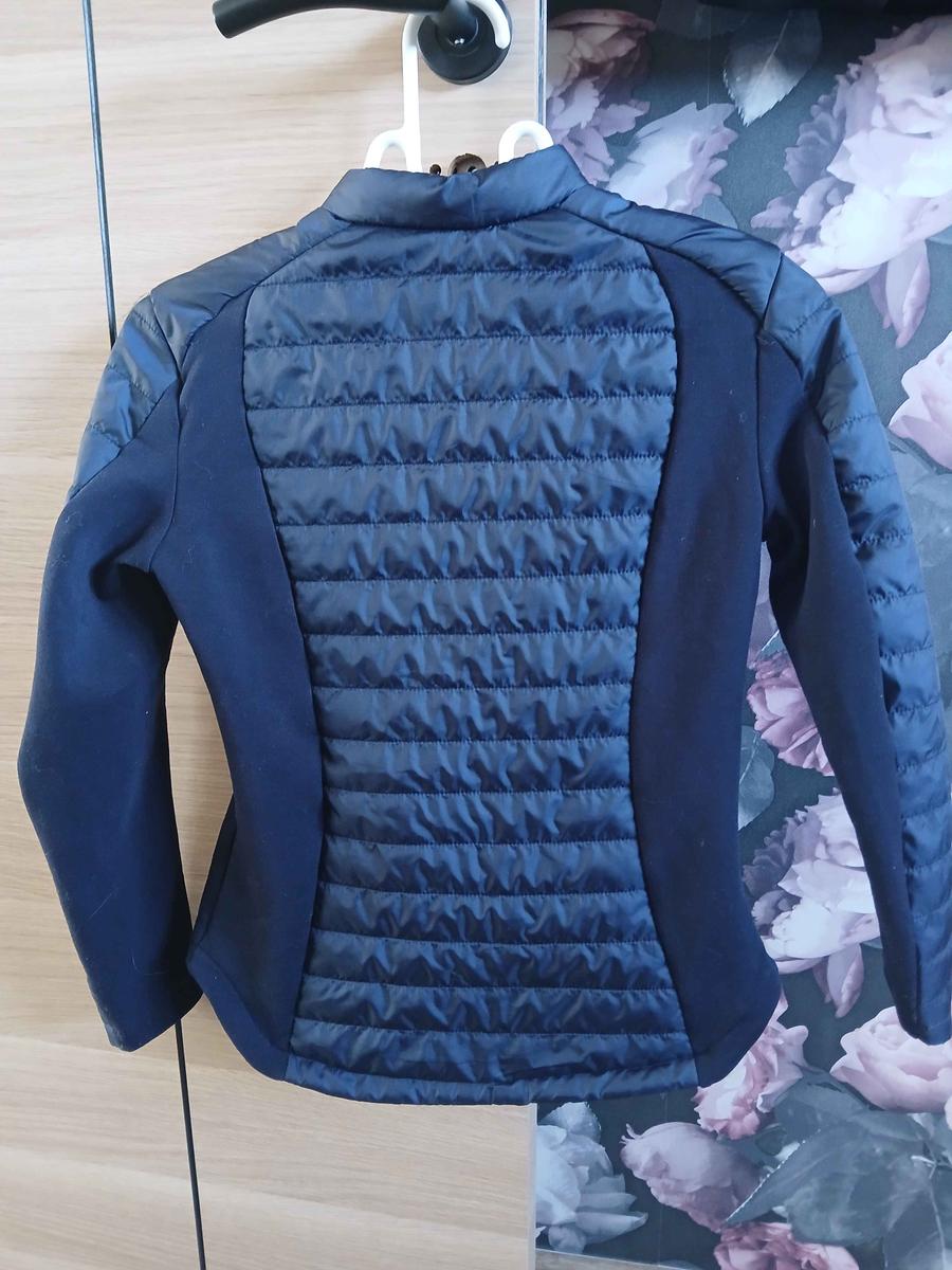 veste bleu marine en parfait état général, sauf au niveau de la manche, présence d un accros voir photo