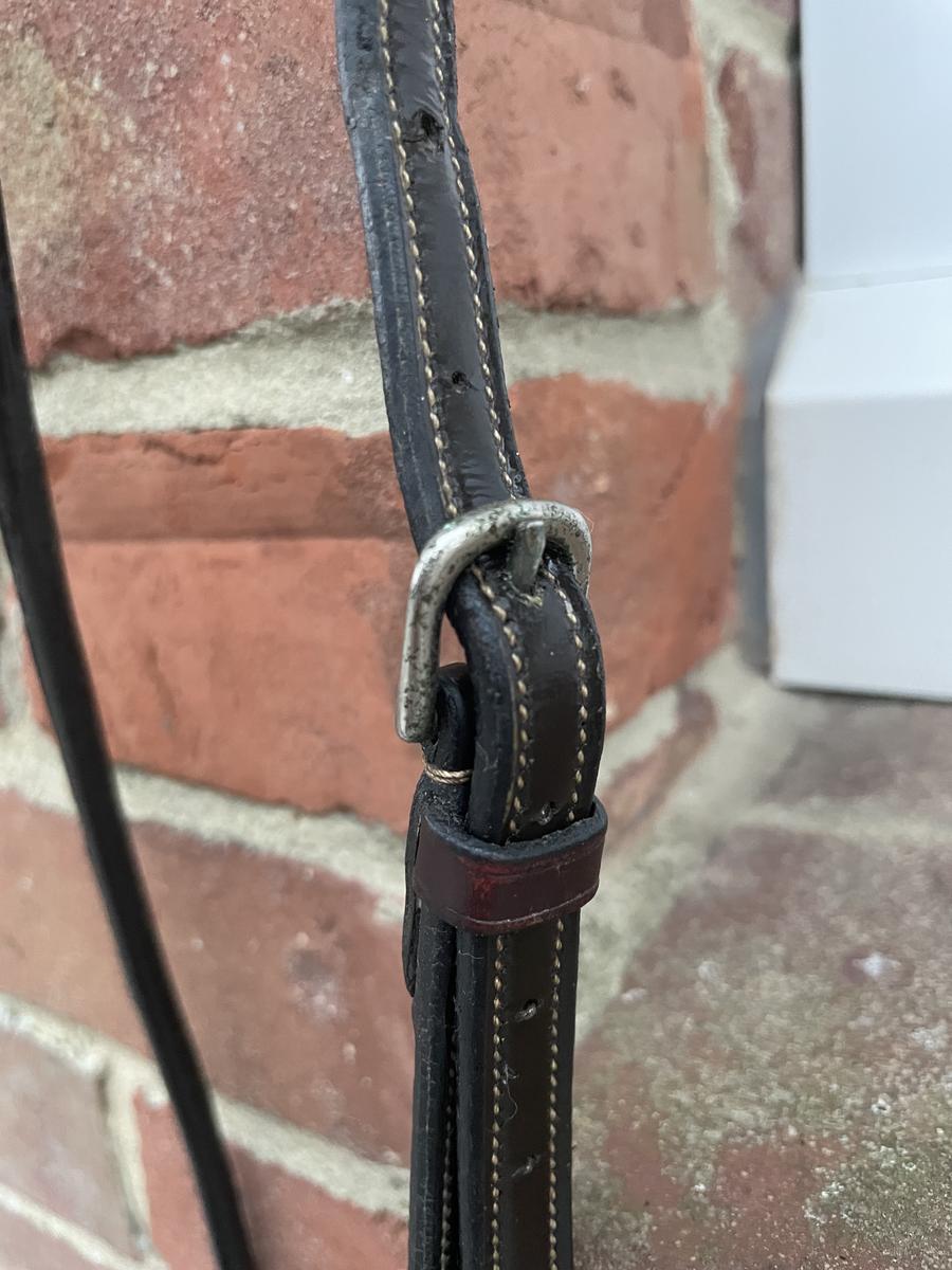 Martingale en cuir havane de la marque Équipe. Très joli détail au niveau du cuir des anneaux et de l’encolure, celui-ci est rond et vernis.