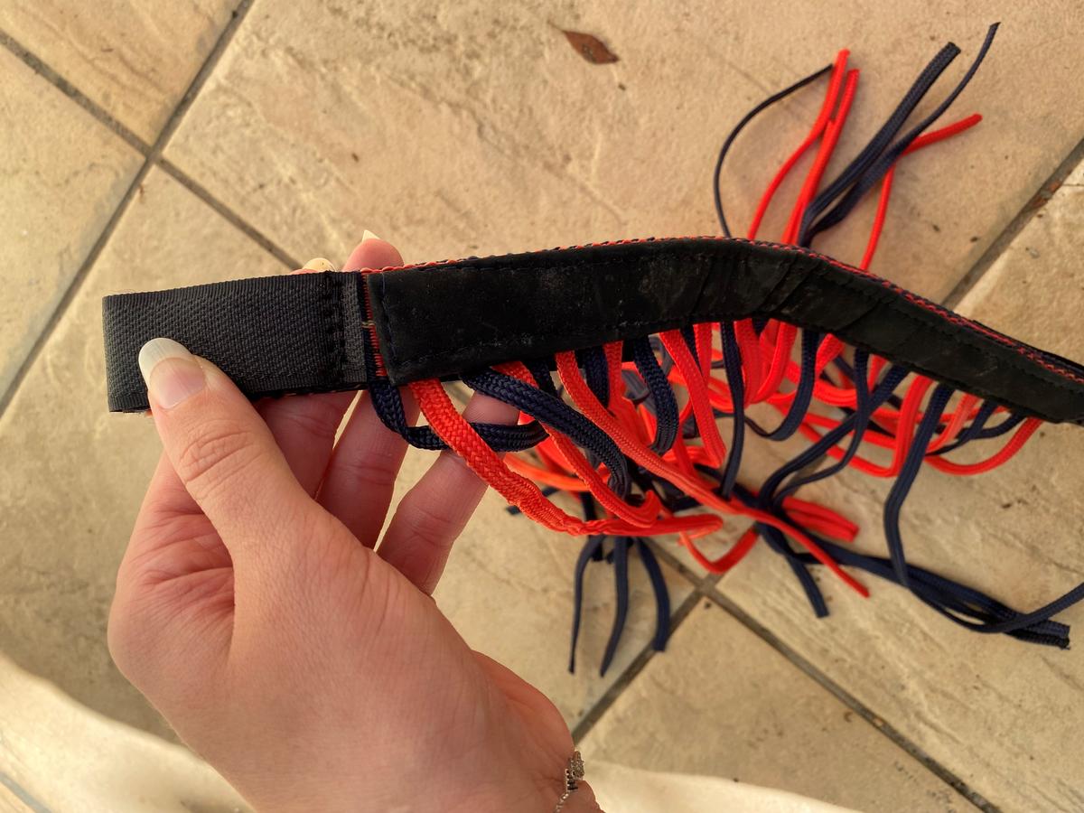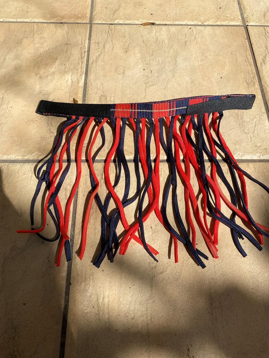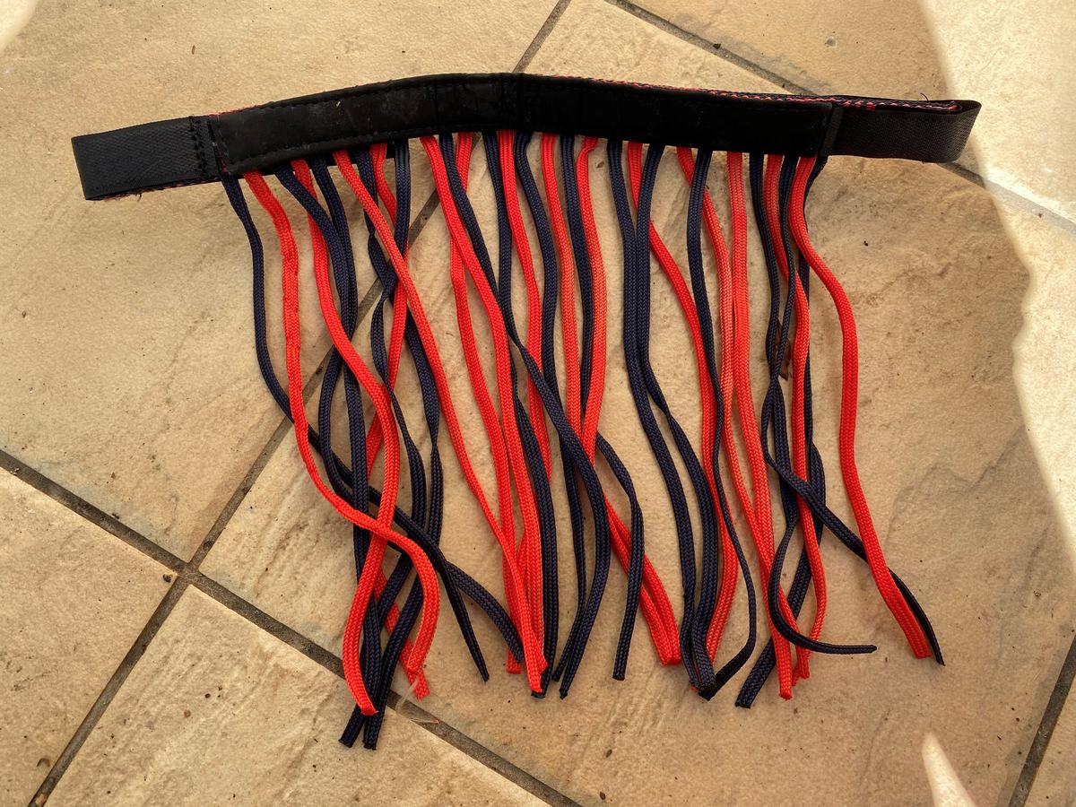 Frontal anti-mouche taille Cheval, de couleur rouge et bleu marine, de marque inconnue.