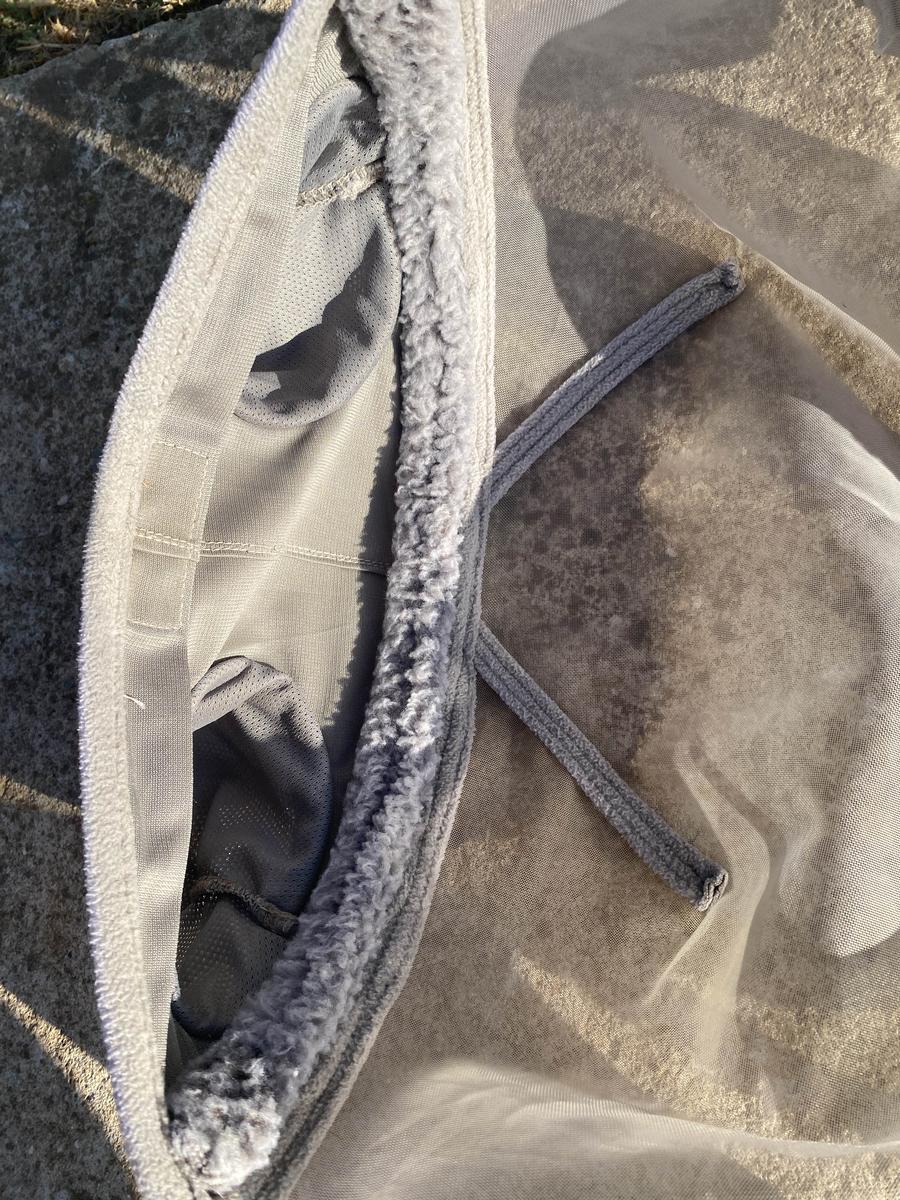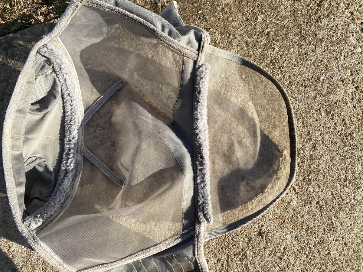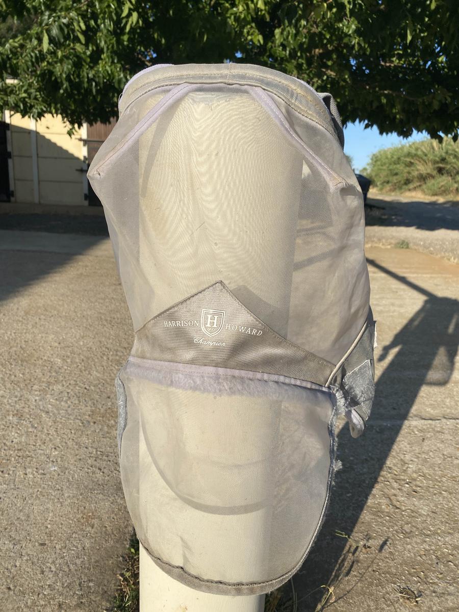 Masque anti-mouche, gris avec filet gris, avec protection pour le nez fixe. Taille cheval, marque Harrison Howard. Utilisé un été seulement, un accrochage sur le côté gauche du rabat pour le nez et quelque tâche du à la couleur de la terre. Mais sinon en très bon état nettoyer sur les photos, peut encore énormément servir