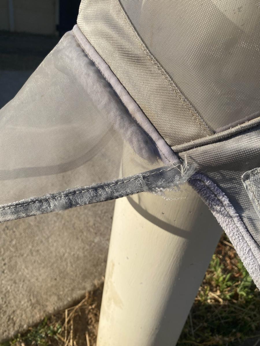 Masque anti-mouche, gris avec filet gris, avec protection pour le nez fixe. Taille cheval, marque Harrison Howard. Utilisé un été seulement, un accrochage sur le côté gauche du rabat pour le nez et quelque tâche du à la couleur de la terre. Mais sinon en très bon état nettoyer sur les photos, peut encore énormément servir