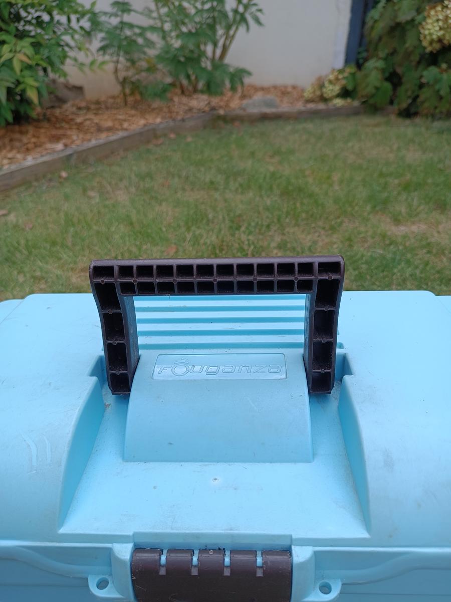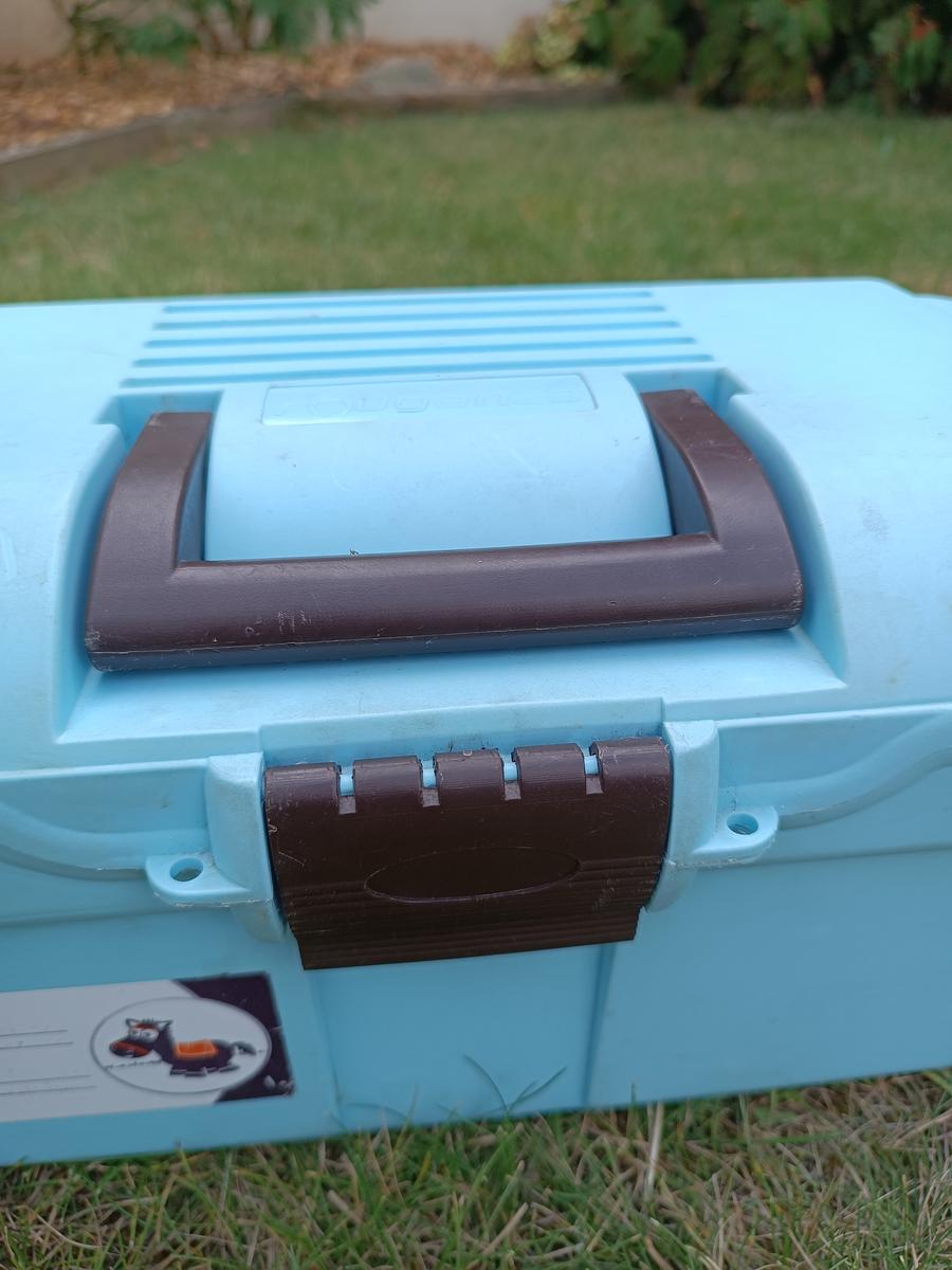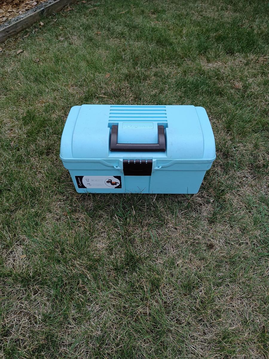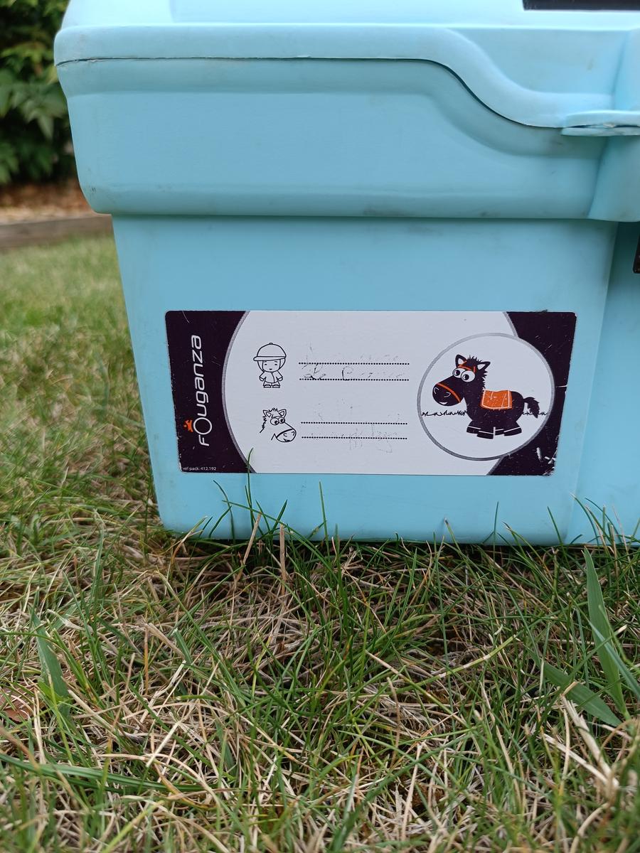 Boite de pansage bleue Fouganza. Traces d'usure visible mais reste en très bon état ! Vendue sans brosses.